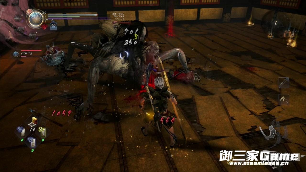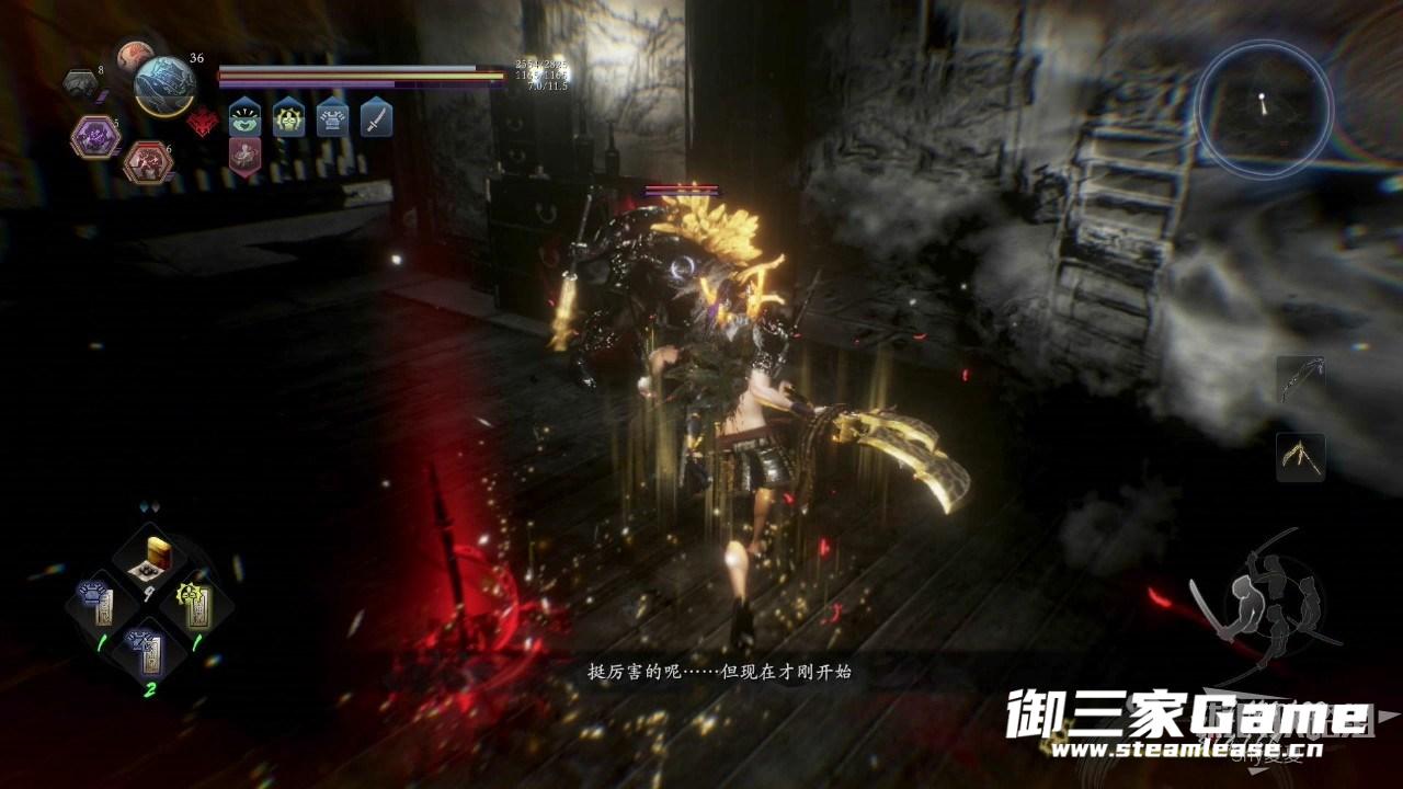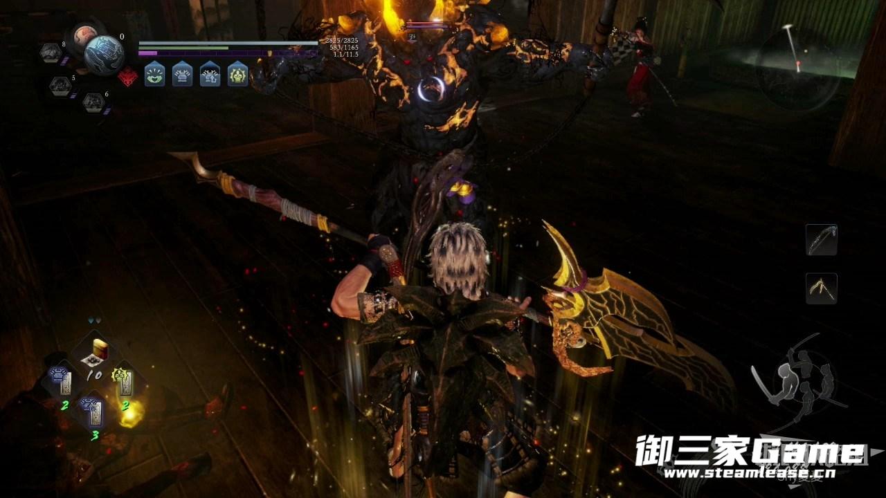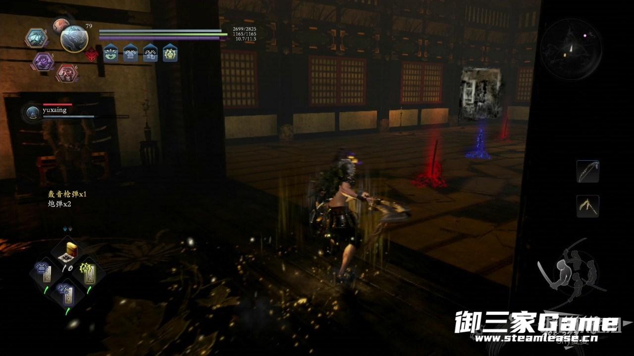 继续前进,路上杀掉一个祸津武士后,可以下梯子走捷径会神社补给,补给好了来下一场战斗,敌人第一波:祸津武士;第二波敌人:古笼火、姑获鸟;第三波敌人:巨僧;第四波敌人:常暗状态,祸津武士。
