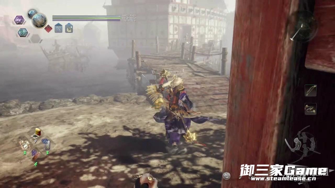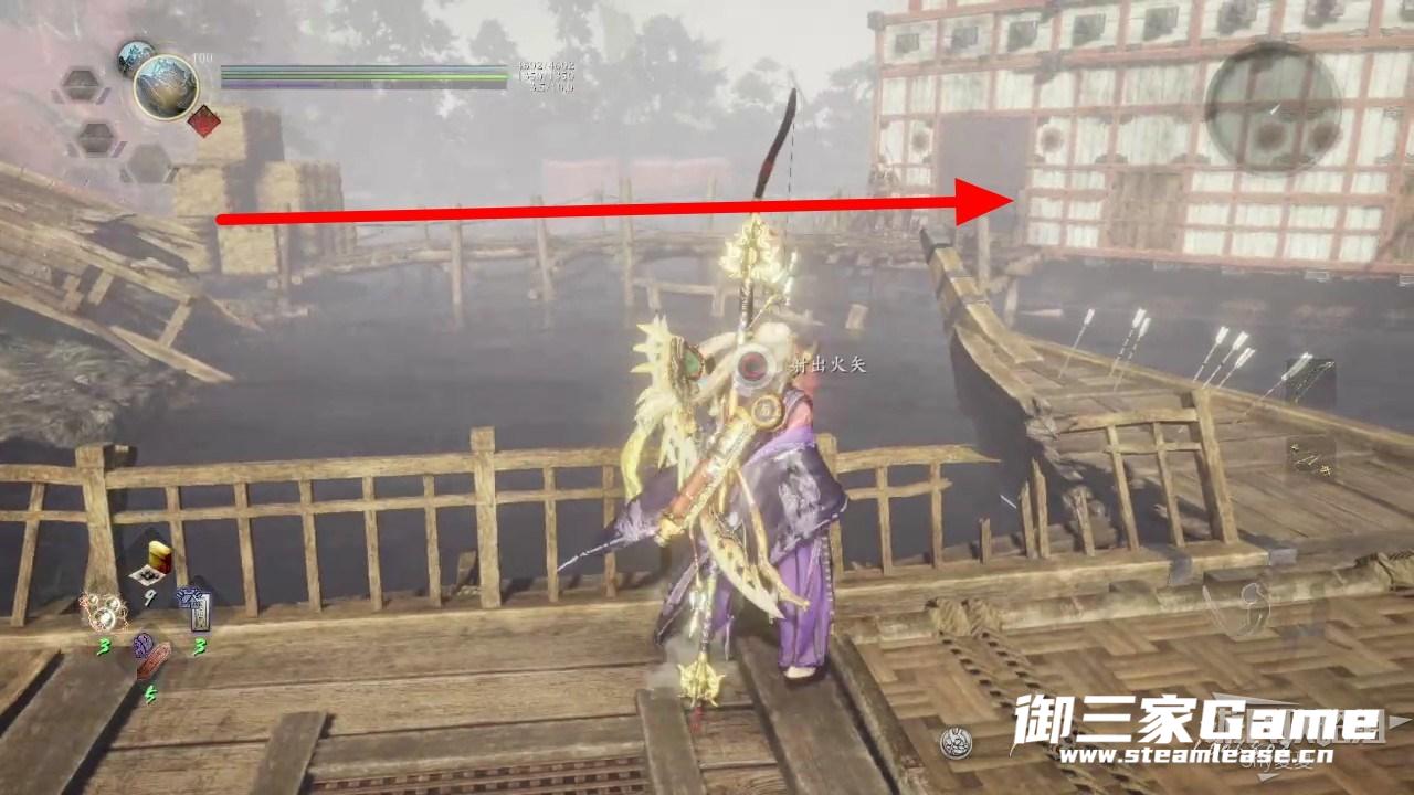 从神社旁边的门出去,到河边,河边会看到一个在与妖蟹大家的武士,帮他清理完妖蟹后对话,获得大弓火矢,然后可以去右边的屋子里获得一个宝箱。