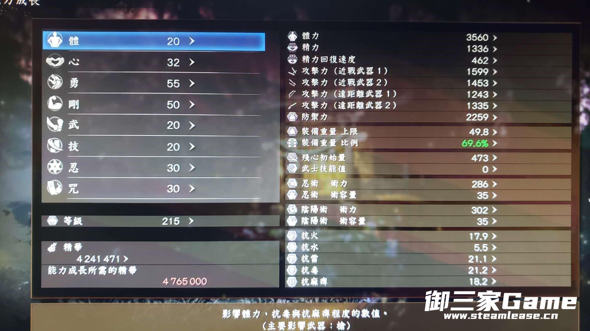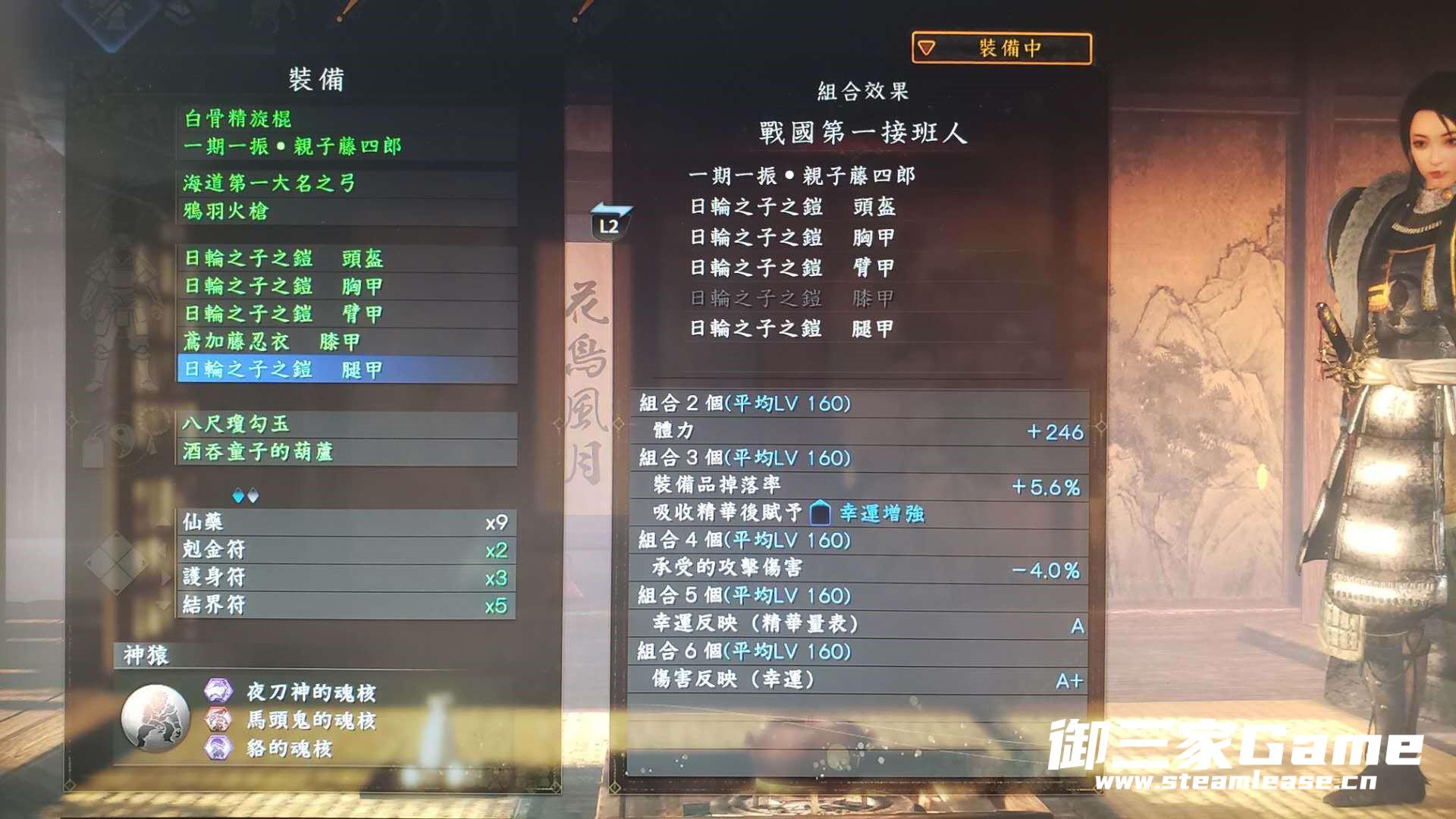 我选择的套装是秀吉的重甲套装,高霸体,之所以不穿全,是因为等级不够哈哈(目前215如果穿全的话需要85点刚),所以腿甲选了个最轻的(衣服和腿最重,刷到哪一个另一个换轻的之后洗点)