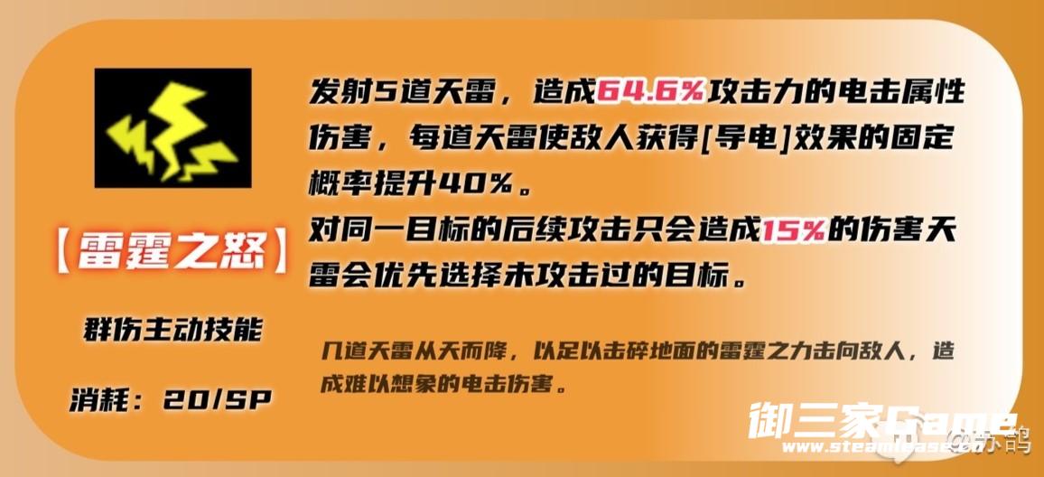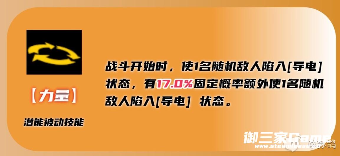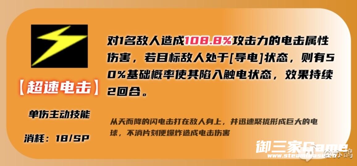 ①单体强力攻击,如果攻击处于导电状态的敌人,还有50%的概率使敌人陷入触电状态,持续2回合。