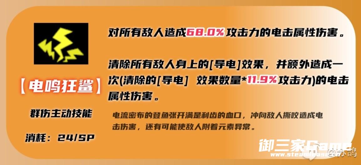 ②优先使用其他技能叠加敌人导电状态的层数,最后在用【电鸣狂鲨】清除敌人身上的导电状态,可以造成大量伤害。