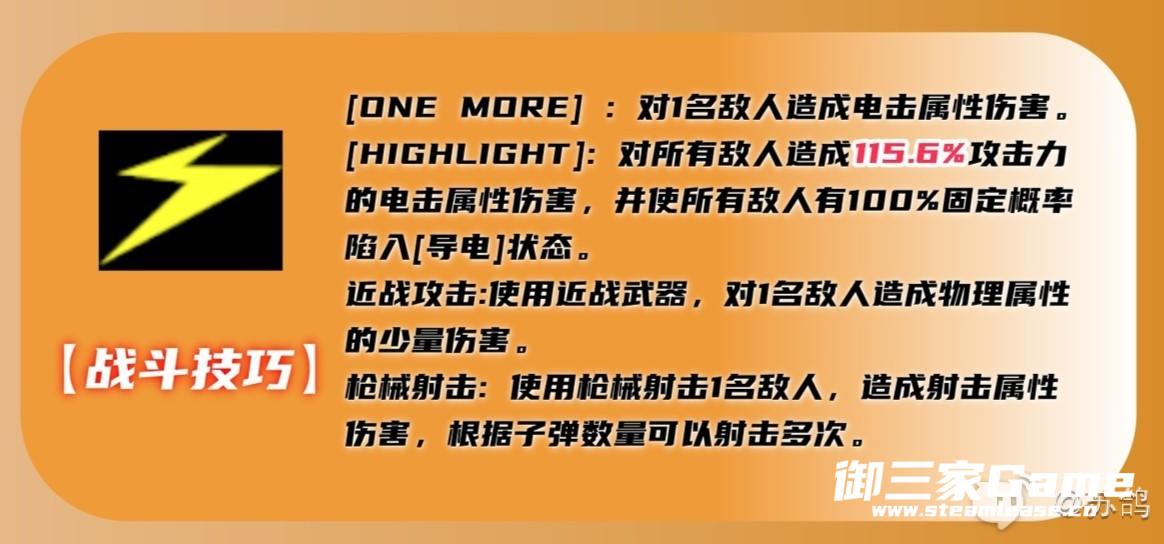 ②【HIGHLIGHT】:群体增伤大招,有100%的固定概率使敌人陷入导电状态。