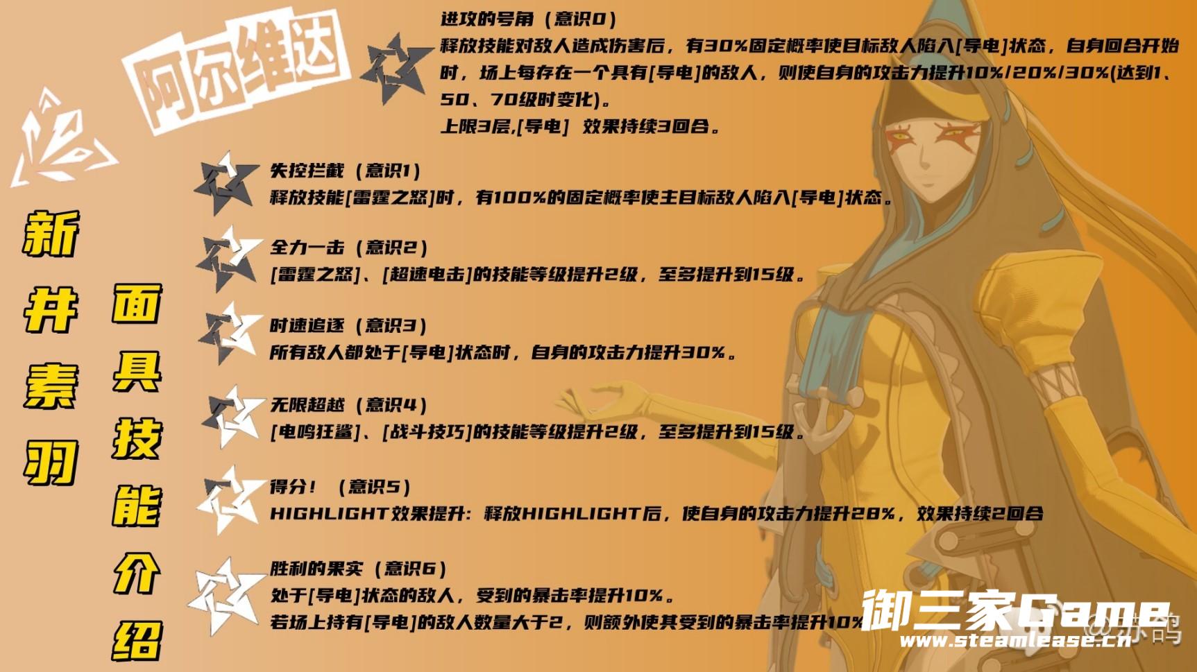 阿尔维达:作为新井素羽的专属面具,随着面具意识的进阶,可以提升很多对导电异常状态的敌人的伤害,并且可以更好的触发导电效果,导电状态的敌人越多,新井素羽的伤害越高,是一个很不错的群伤角色。