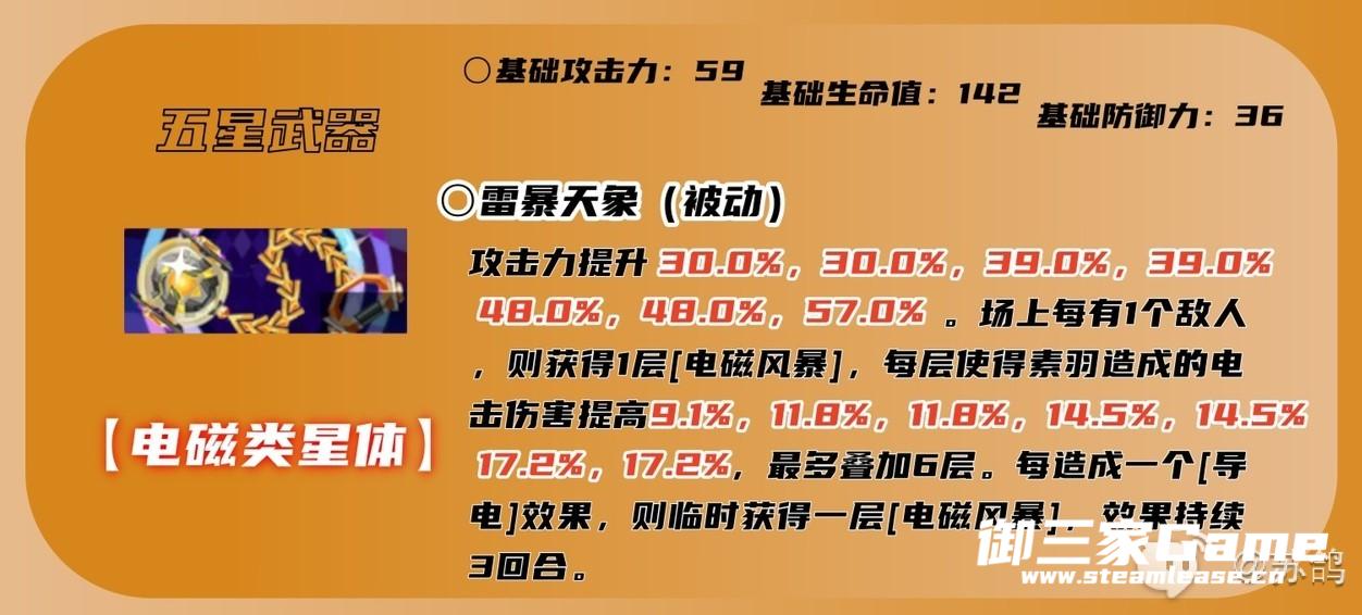 新井素羽的五星专属武器,超高的攻击力加成,配合武器被动【电磁风暴】赐予的电属性伤害加成,敌人越多伤害加成越高,并且每造成一个【导电】效果,都可以叠加一次【电磁风暴】的伤害加成(最多叠加6层)。