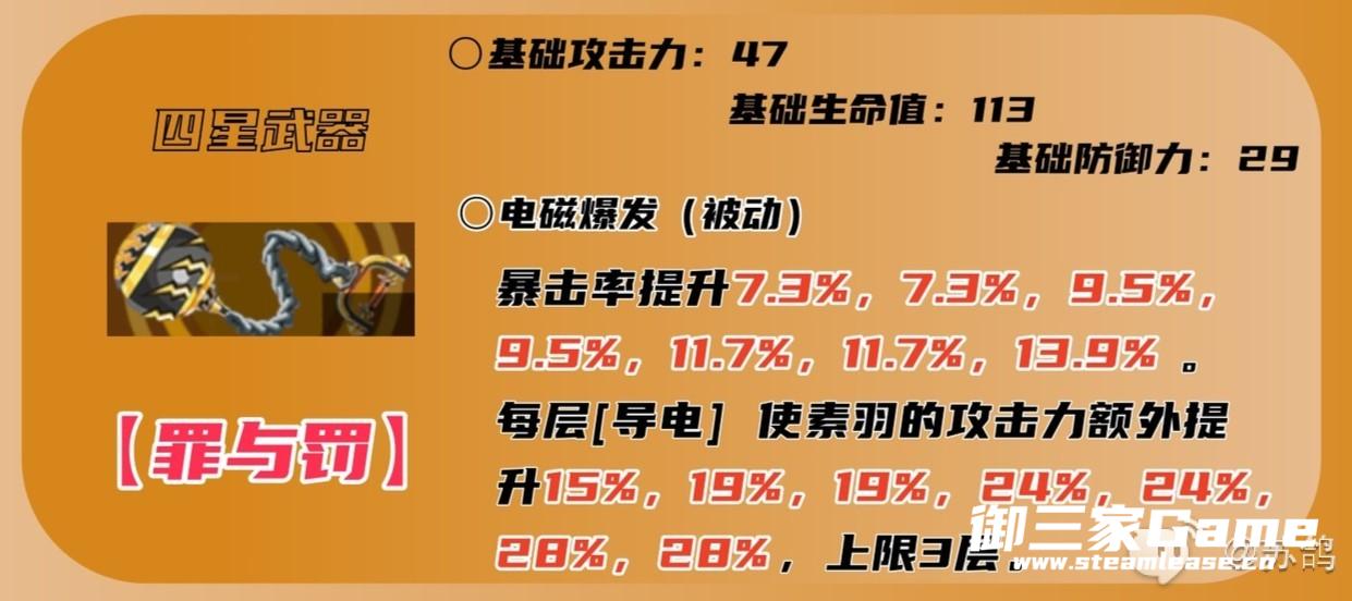 四星专属武器,提升暴击率的同时,会根据【导电】层数(上限3层)提升新井素羽的攻击力,暴击率的提升配合【触电】状态的暴击率加成,可以保证暴击率的触发频率。