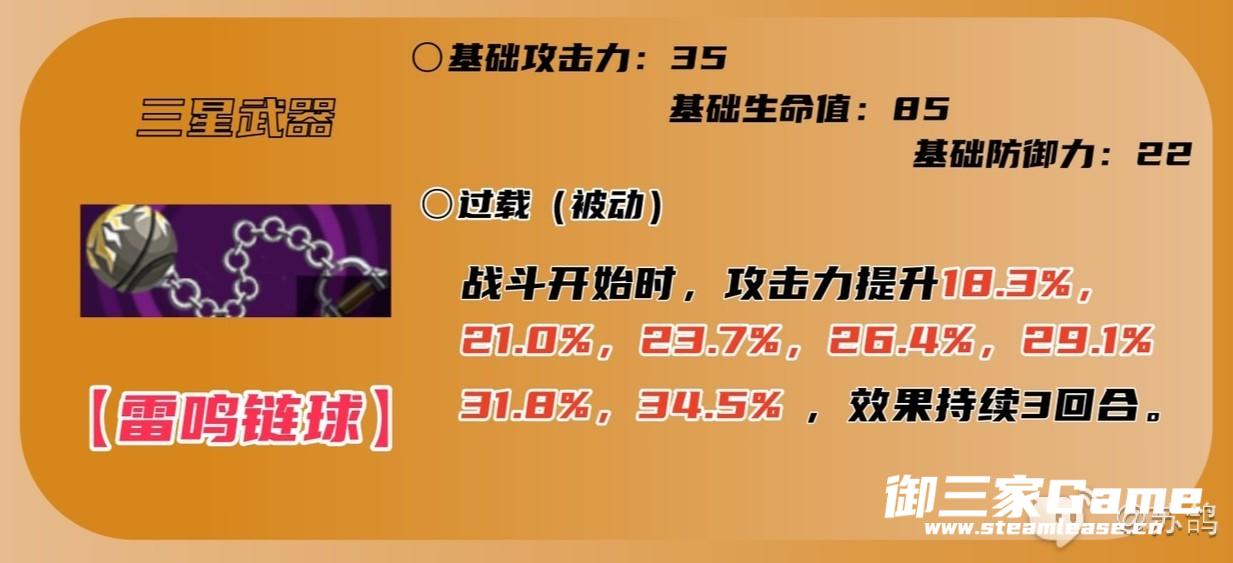 3星过度武器,开局前三回合稳定的提升攻击力,可以保证前三回合的输出,但后续只能吃到武器的基础属性加成,如果是爆发队伍,这个武器也挺适合。