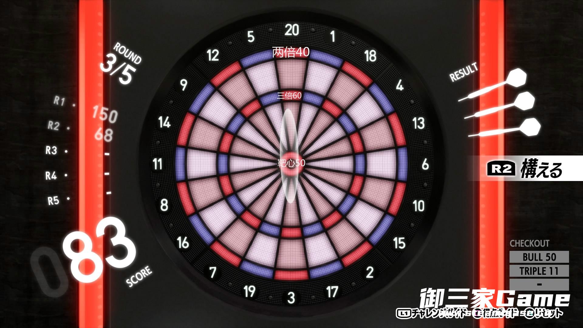然后就是P5R飞镖的小技巧快速提升换手等级,正常玩一次只能提升一级,如果出现下列情况,游玩的伙伴如果第四回合能把分完整扣完则会一次提升两级直接升满。所以如果是伙伴出了301的挑战项目是最方便控分的,尽量如图在第四回合给伙伴留下最少的分数方便他一次投中扣完,当然也有小概率伙伴会爆投没投到。