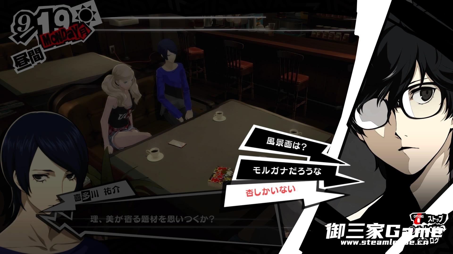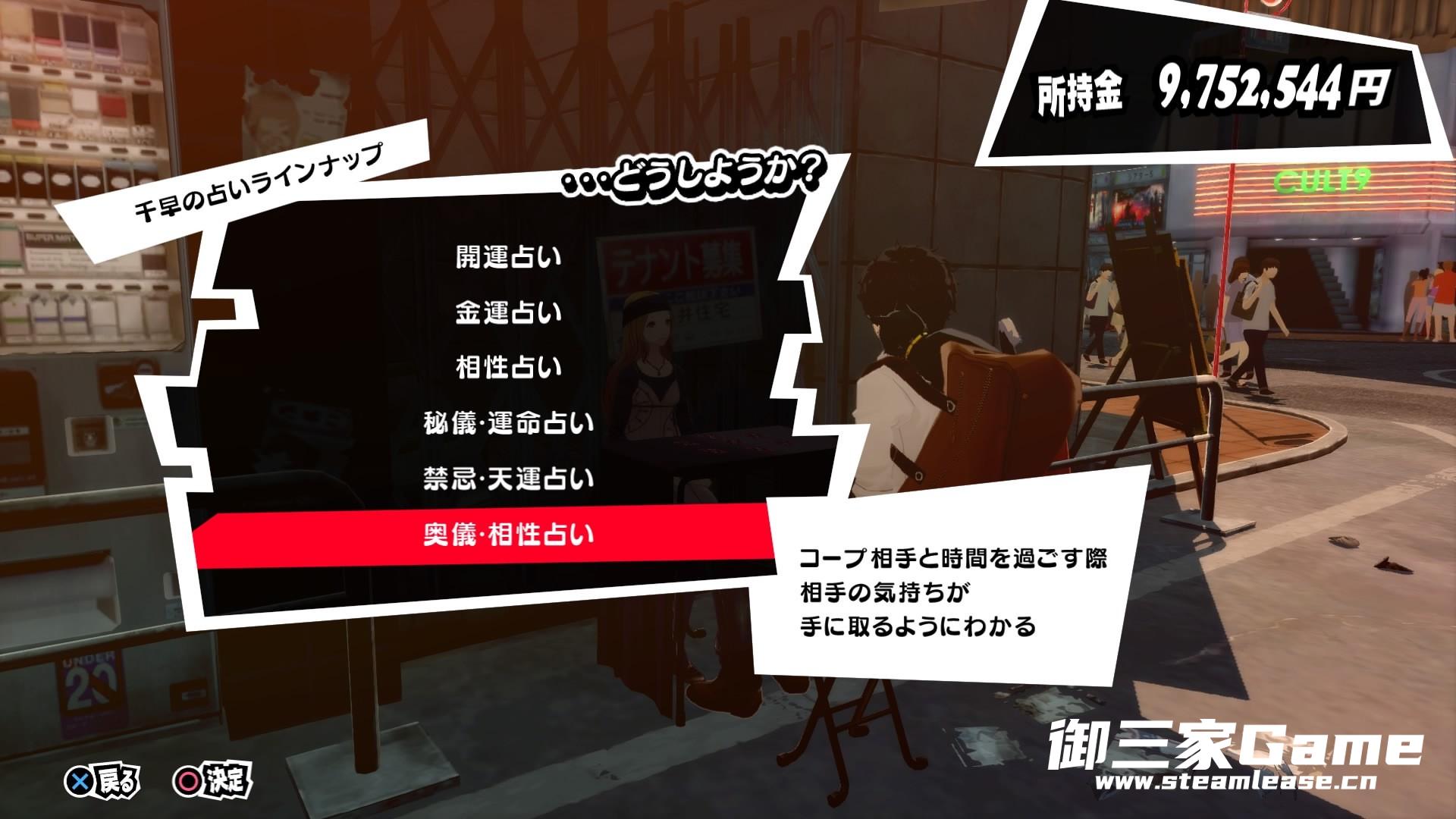然后就是COOPMAX后的奖励奥仪相性占卜,使用后直接会在提升COOP的对话选项和后续的电话谈话中将提升好感最大的选项加红标记出来,基本就相当于官方给你提供的金手指。但是注意如果要跟女角色达成恋爱关系,这个占卜可就不那么靠谱了,有些女角的恋爱选项反而是不加好感度的才会达成。自己多注意吧。