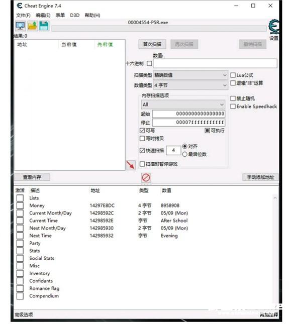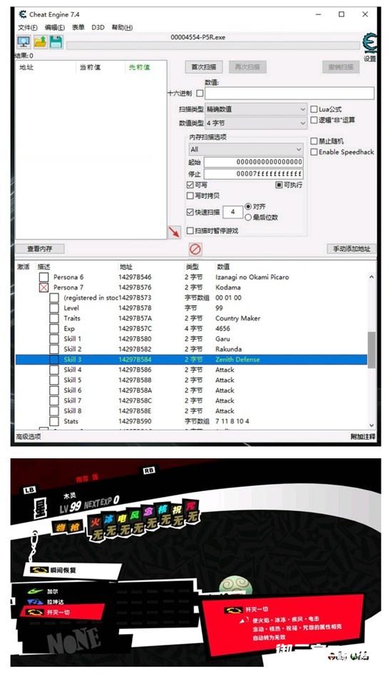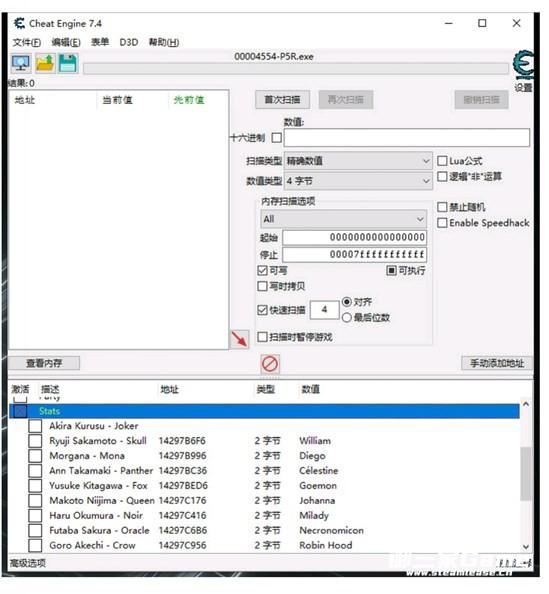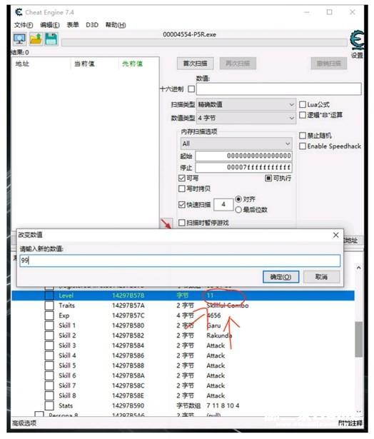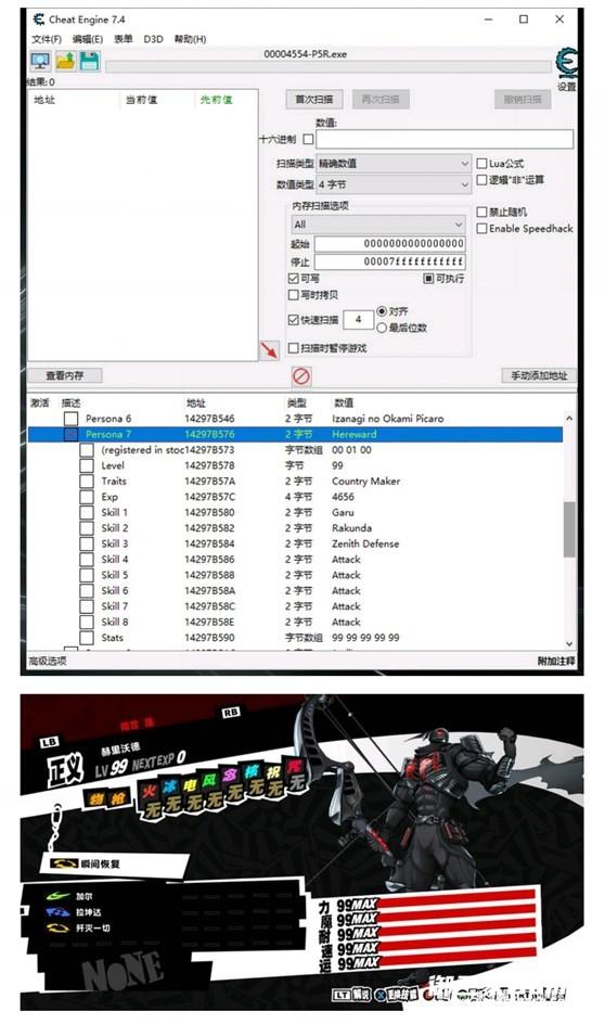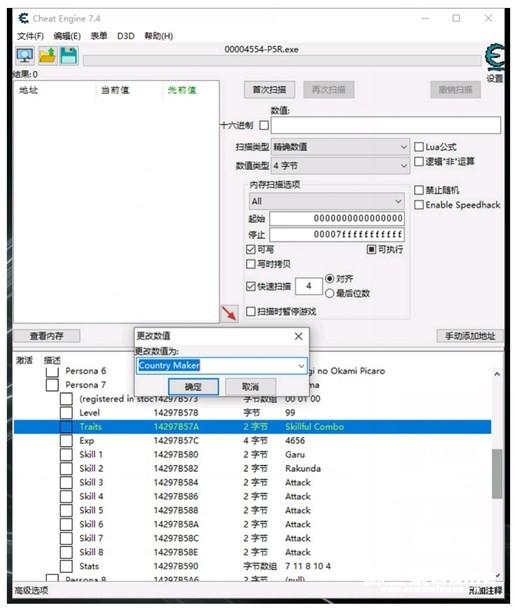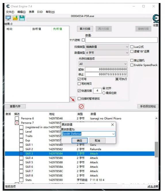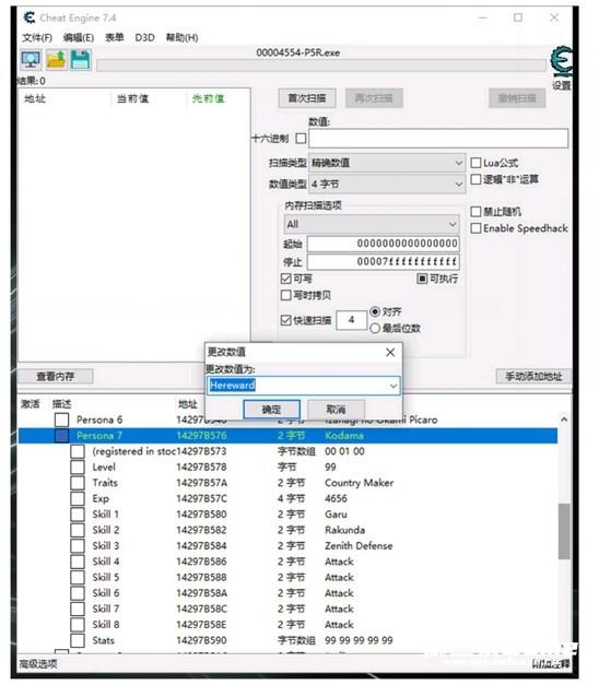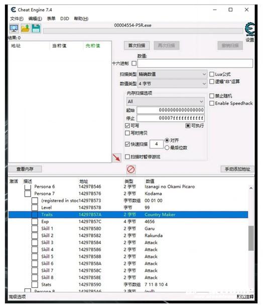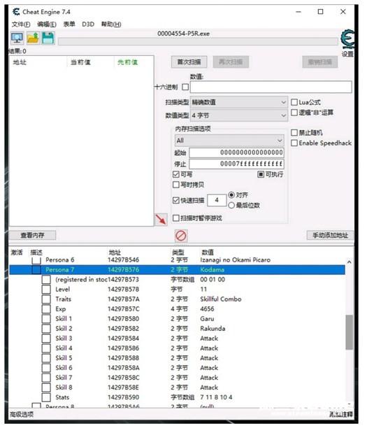 5.在 CE 中选择修改对象所在的位置(本文中为 7 号位,故选择 Persona7),其中数值一栏为修改时双击的对象。