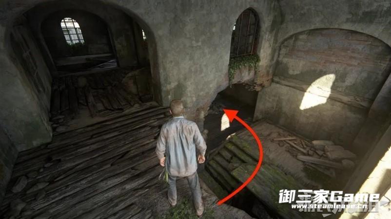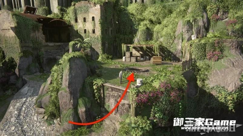 经过多次攀爬和绳索摆荡后,前往监狱塔楼的废墟,爬窗户进入塔楼,来到右侧较低处,宝藏就在柱子旁边。