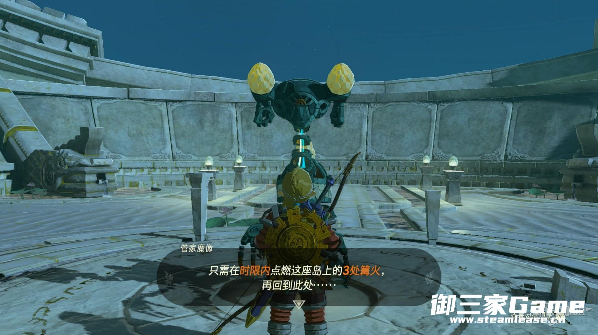 在时之神殿顶部与管家魔像交谈开启试炼,我们需要在12个小时内点燃空岛中的三处篝火,且不能落在除神殿屋顶外的其他任何一处地面上。