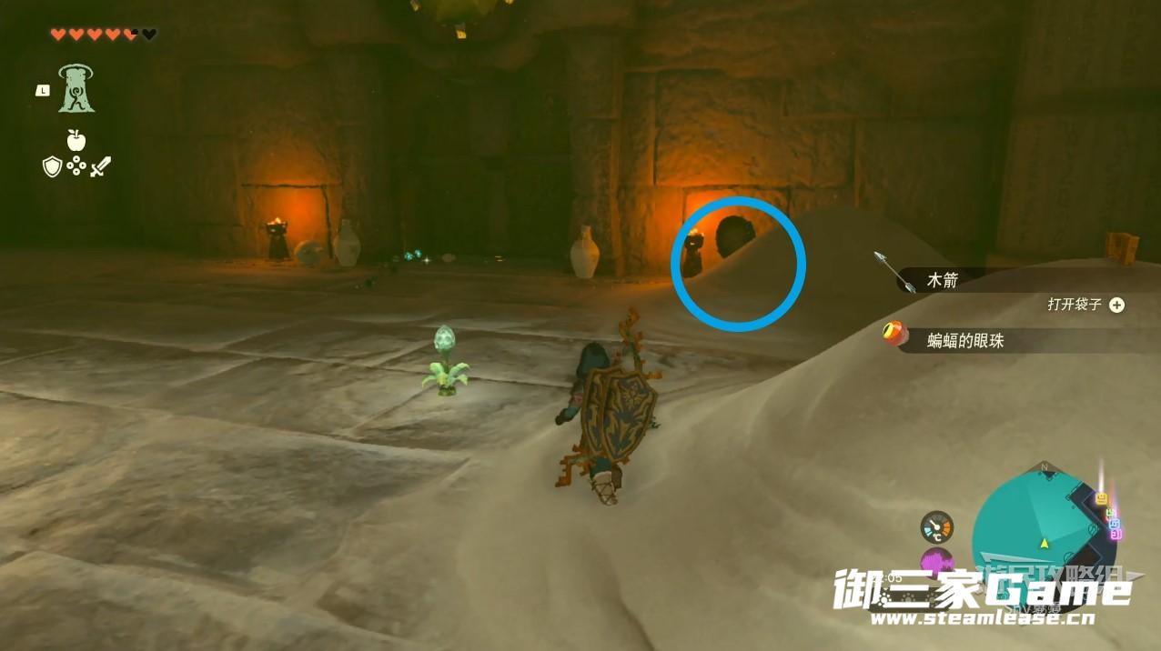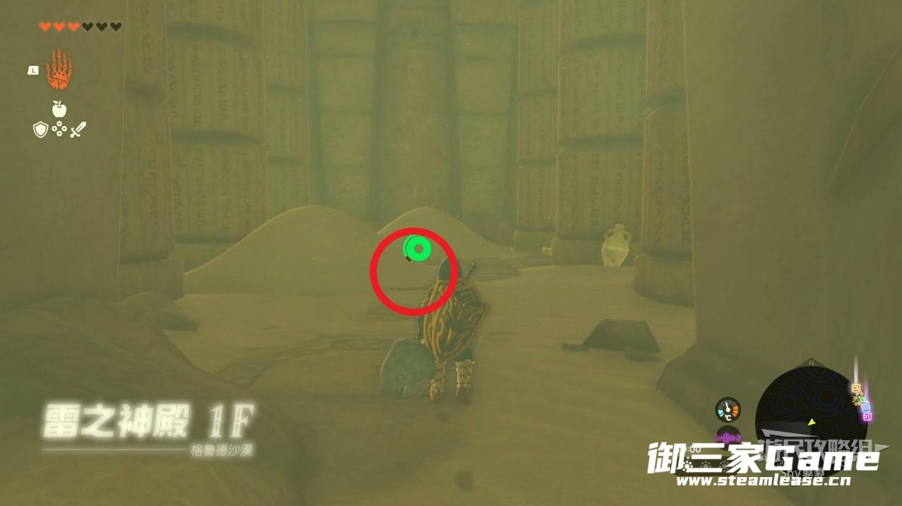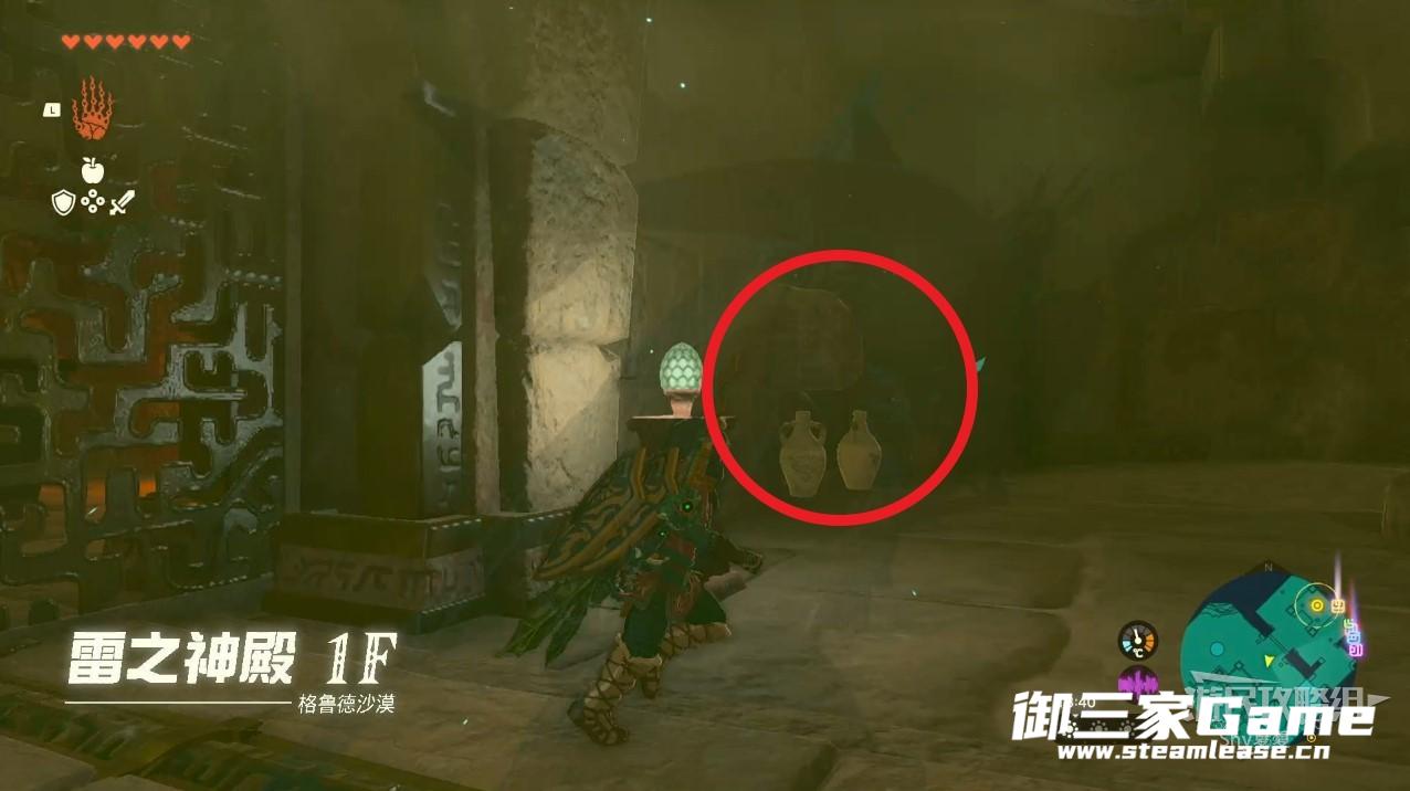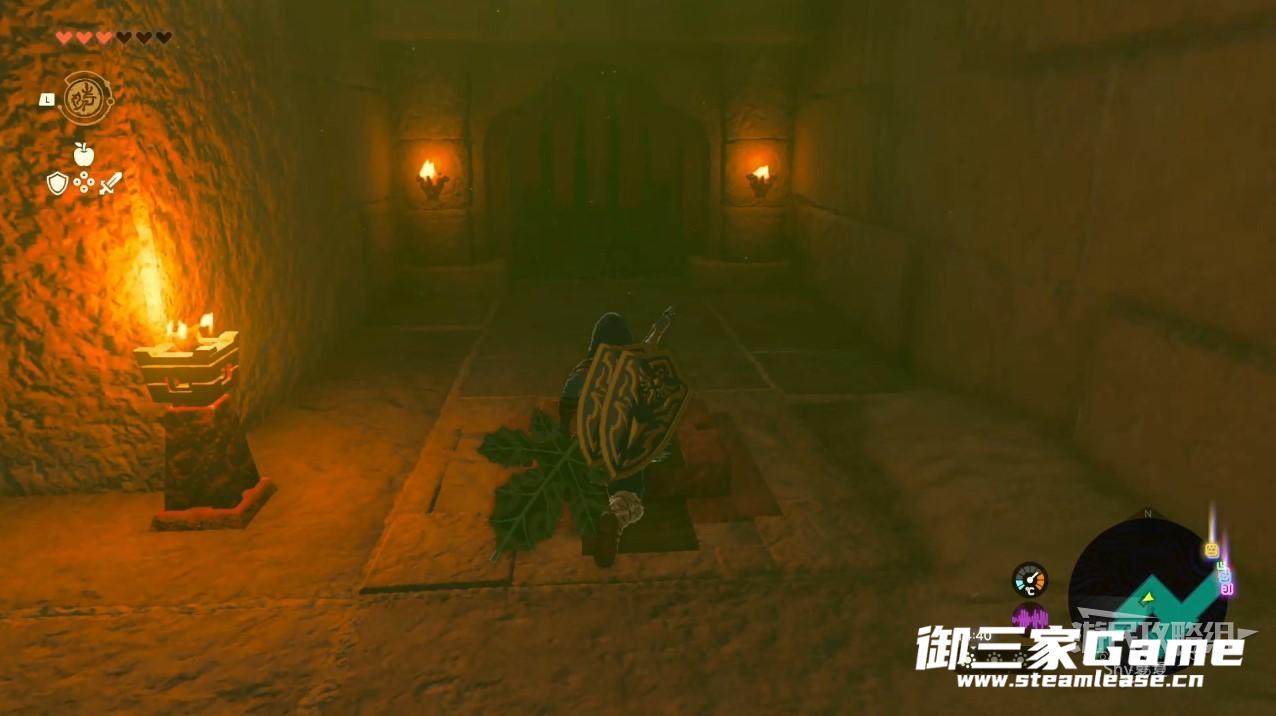 进入神殿后,在墙边找到一把扇子,或者用风扇把沙子都清理掉,然后踩中央地板凸起的地方开启神殿大门。