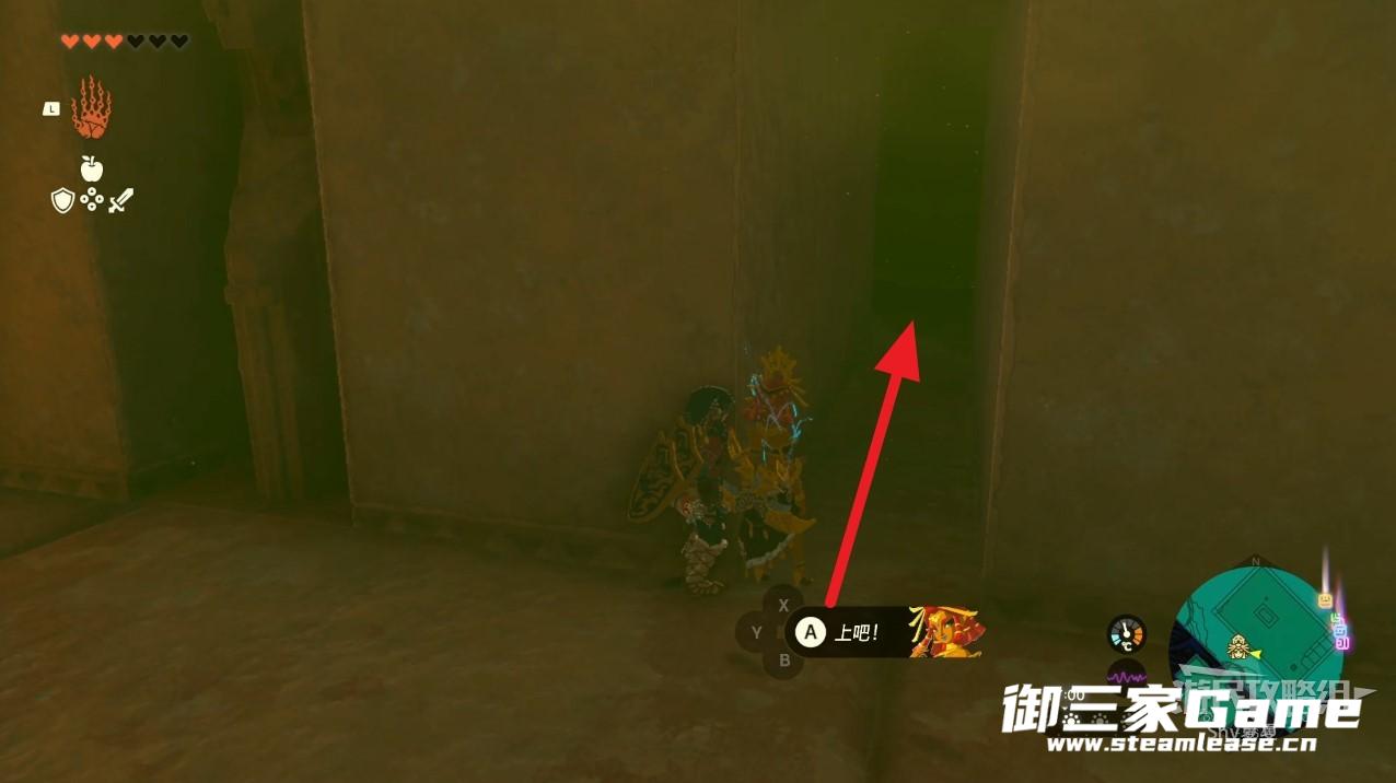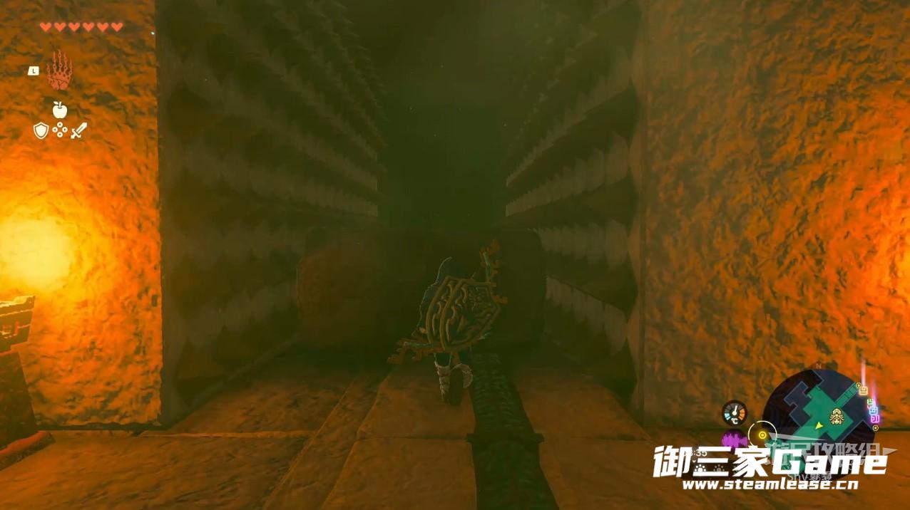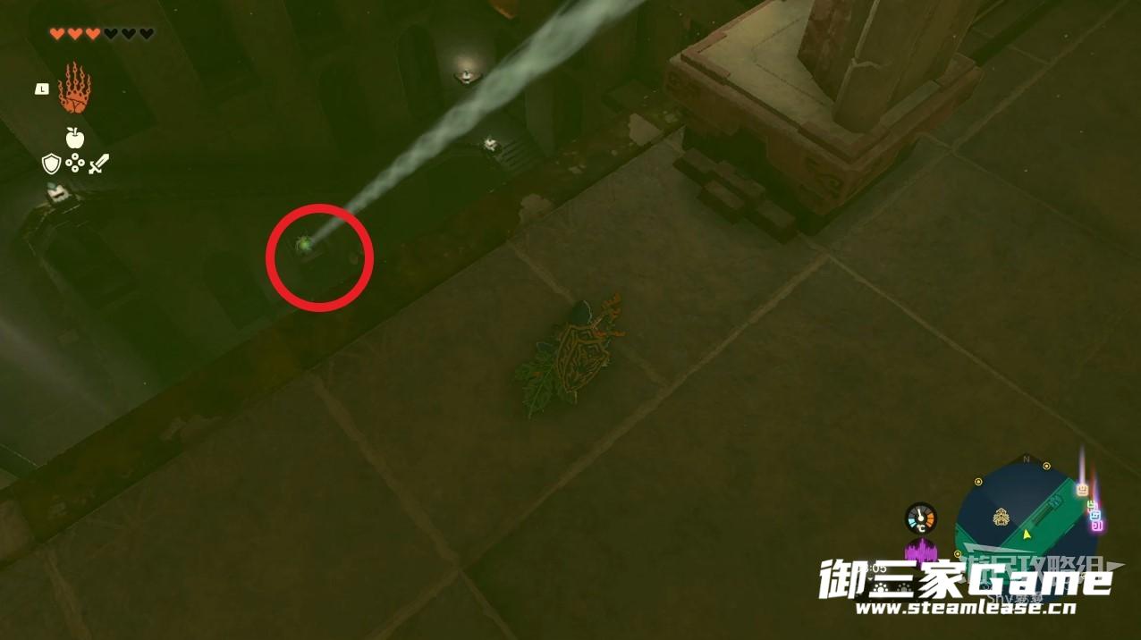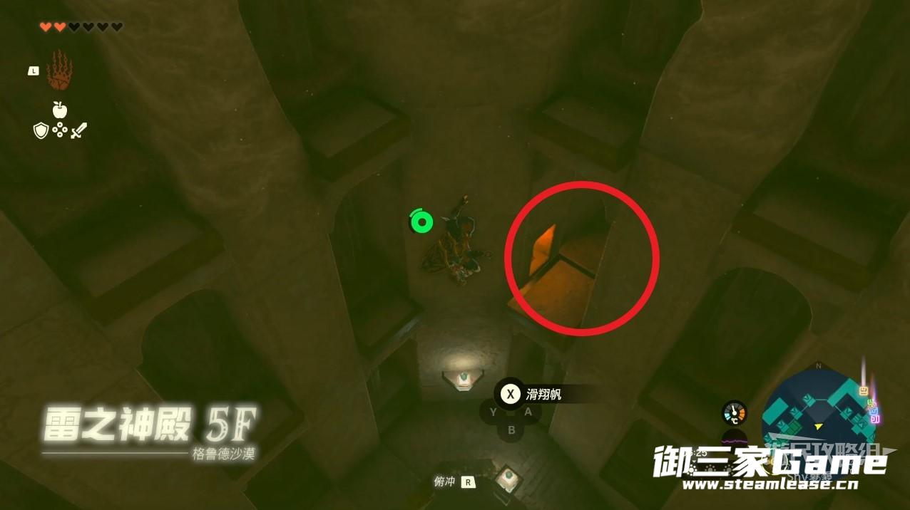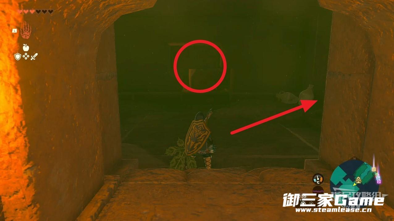 进入神殿后,在墙边找到一把扇子,或者用风扇把沙子都清理掉,然后踩中央地板凸起的地方开启神殿大门。