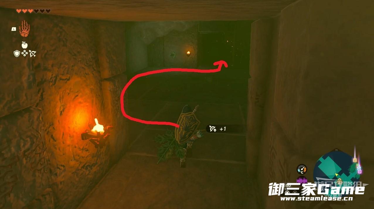一直往里走,会看到两个石头挡住的路,里面有一个敌人、宝箱以及一把武器,可以先去获得。然后回到下图房间向右走。