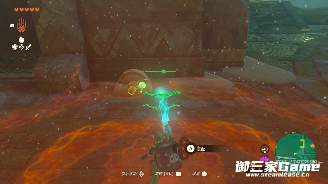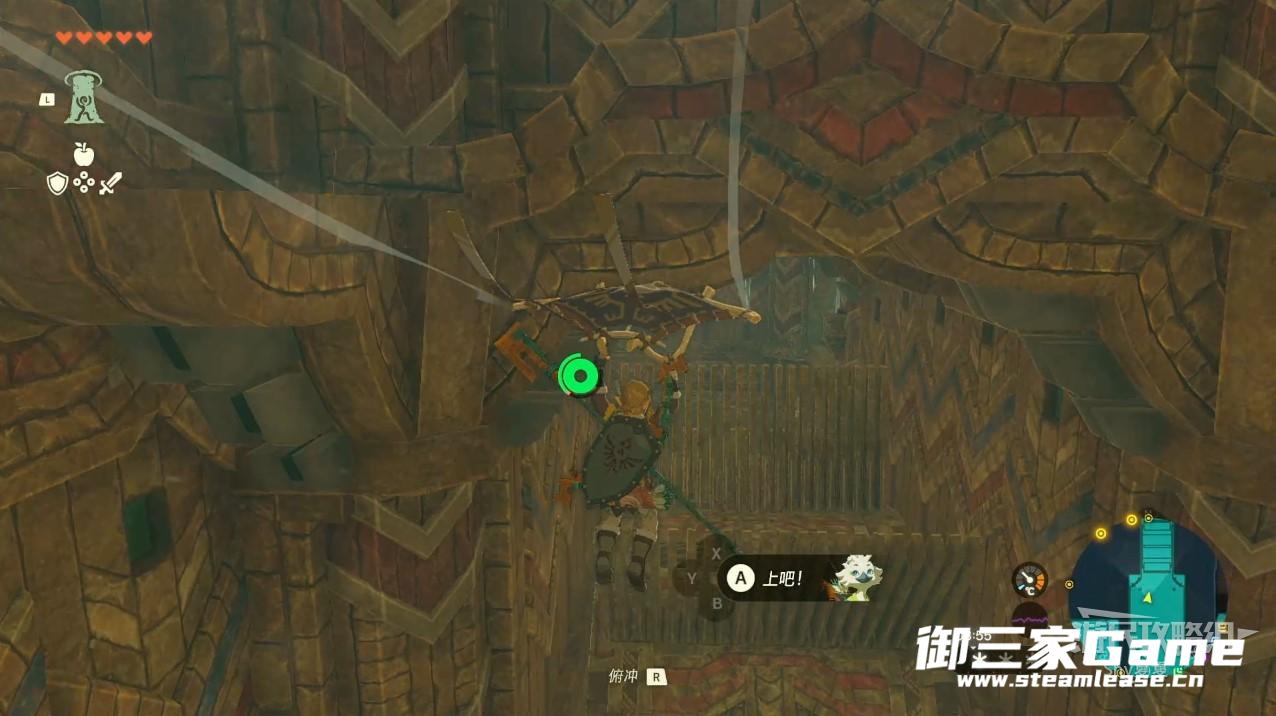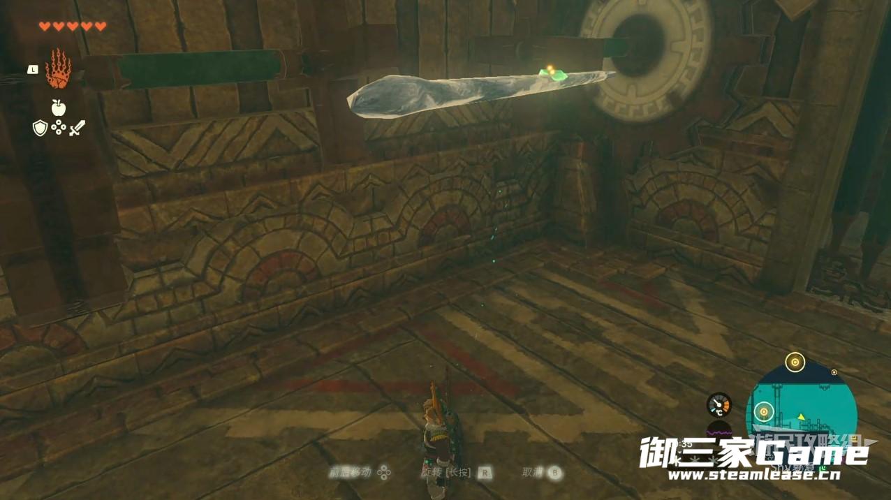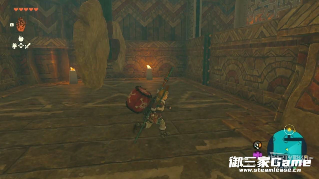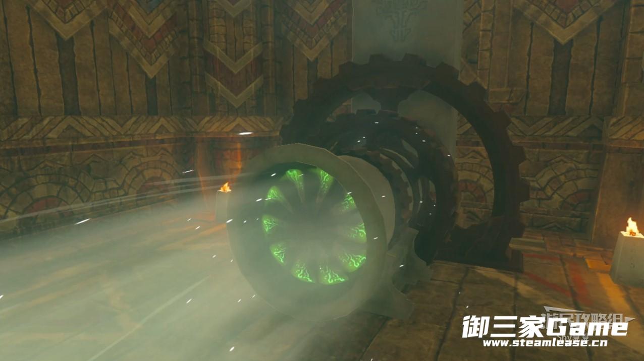 来到上层使用三个石板像下图一样装在柱子上当扇叶,丘栗吹一下,就可以爬上右侧的梯子看到第四个风扇了。