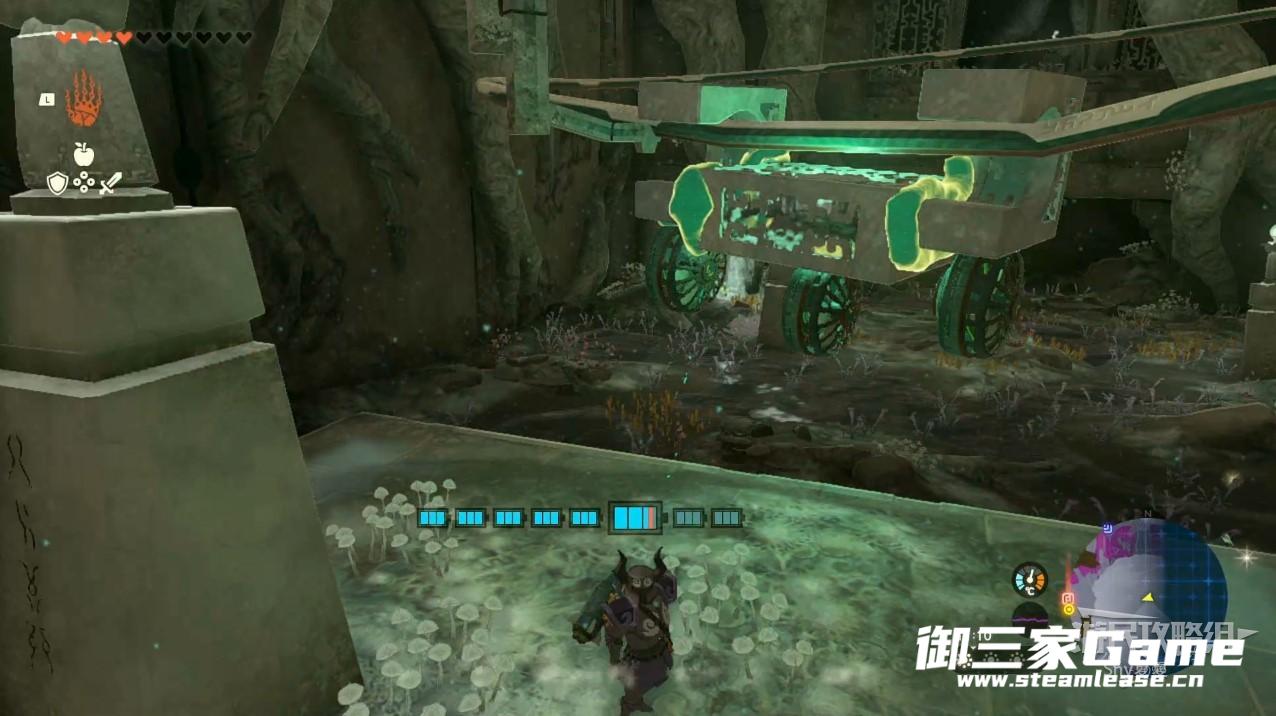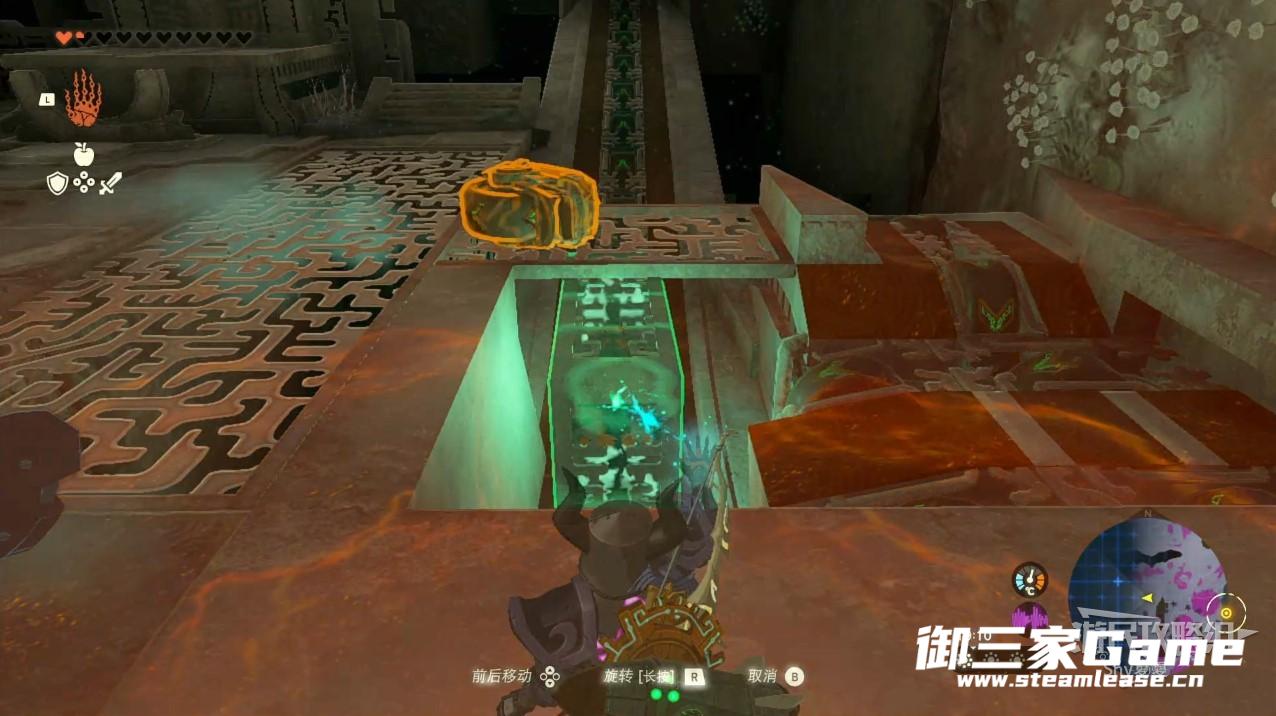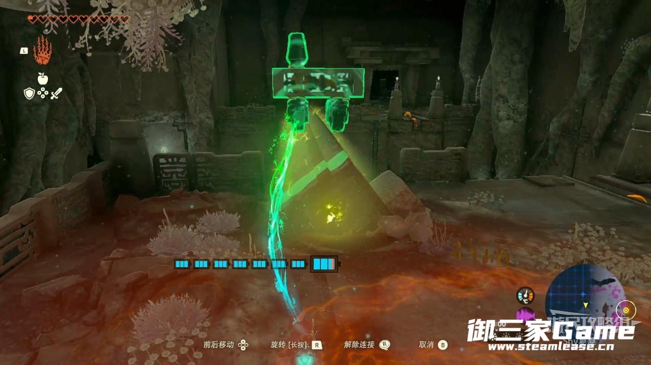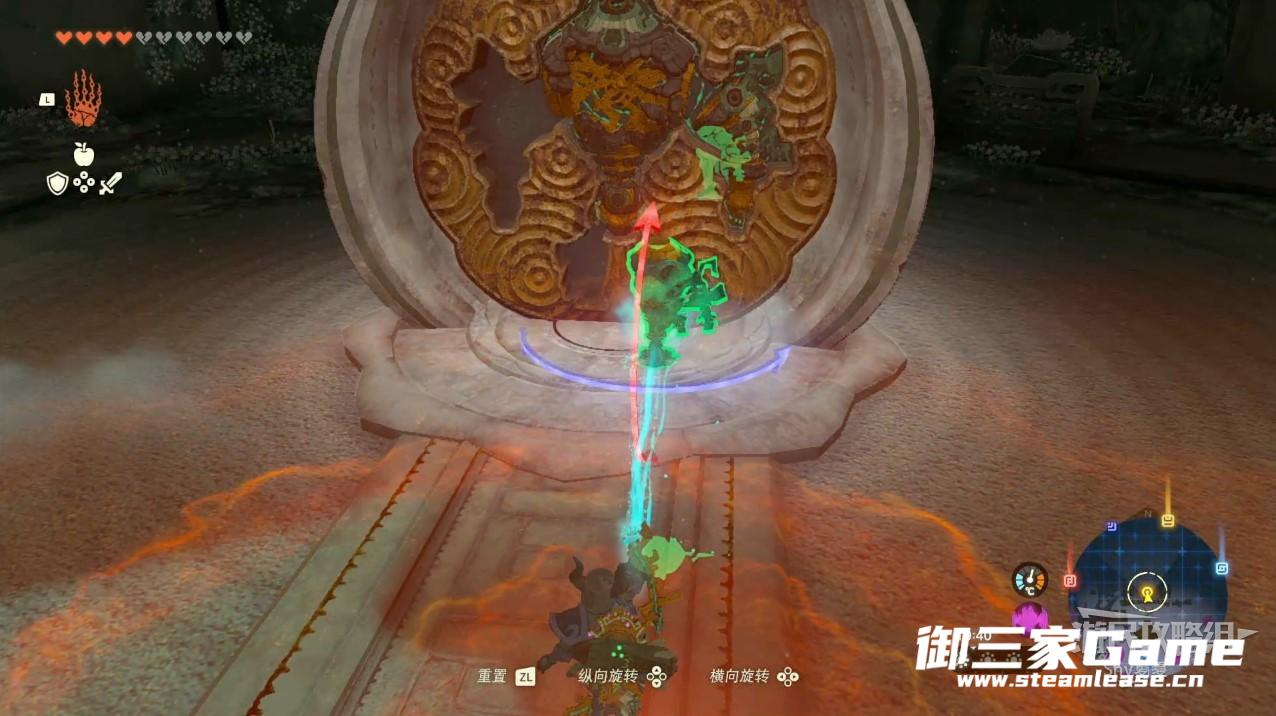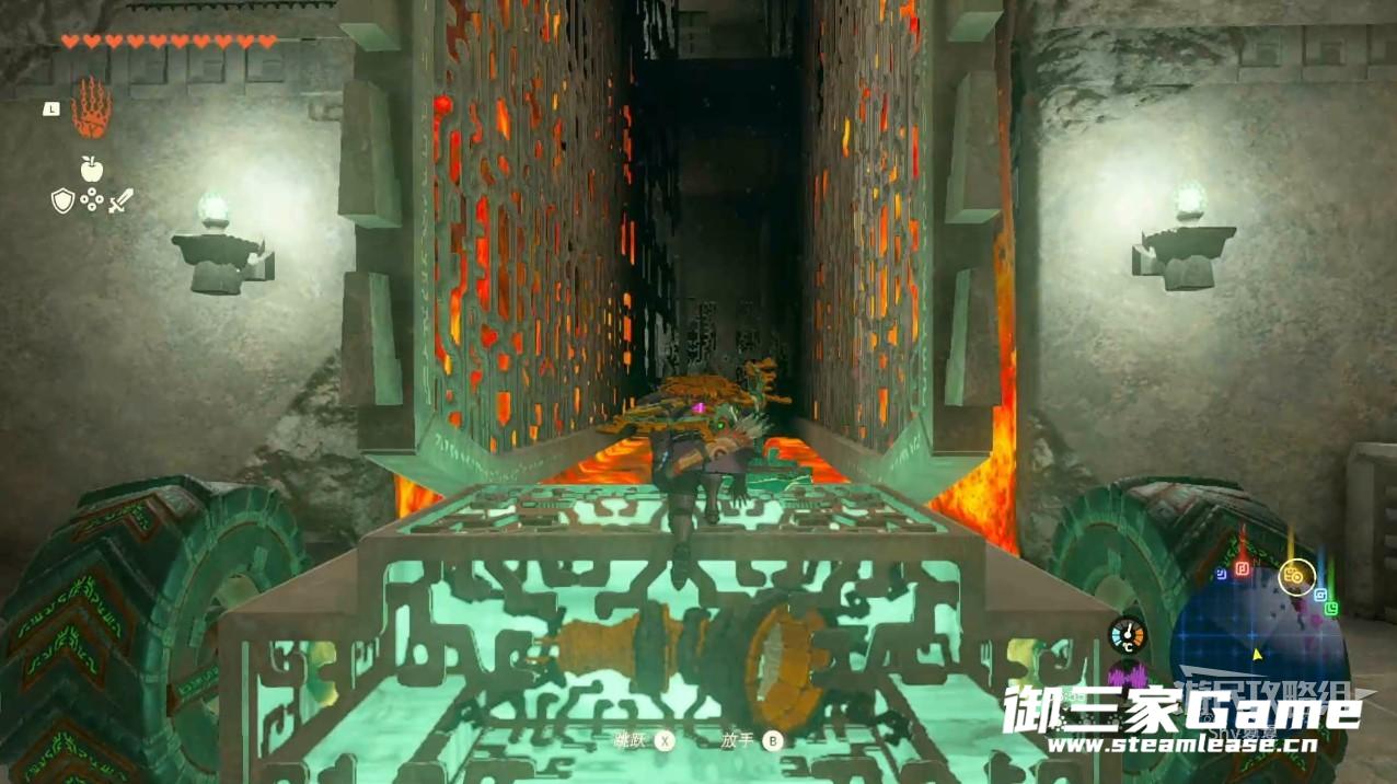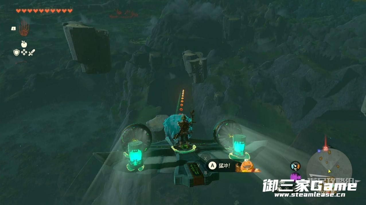 这时先不要启动,而是利用通天术跑到对面的平台上,然后用弓箭射击风扇,就能让装置启动,当经过平台的时候,用究极手拉过来即可。