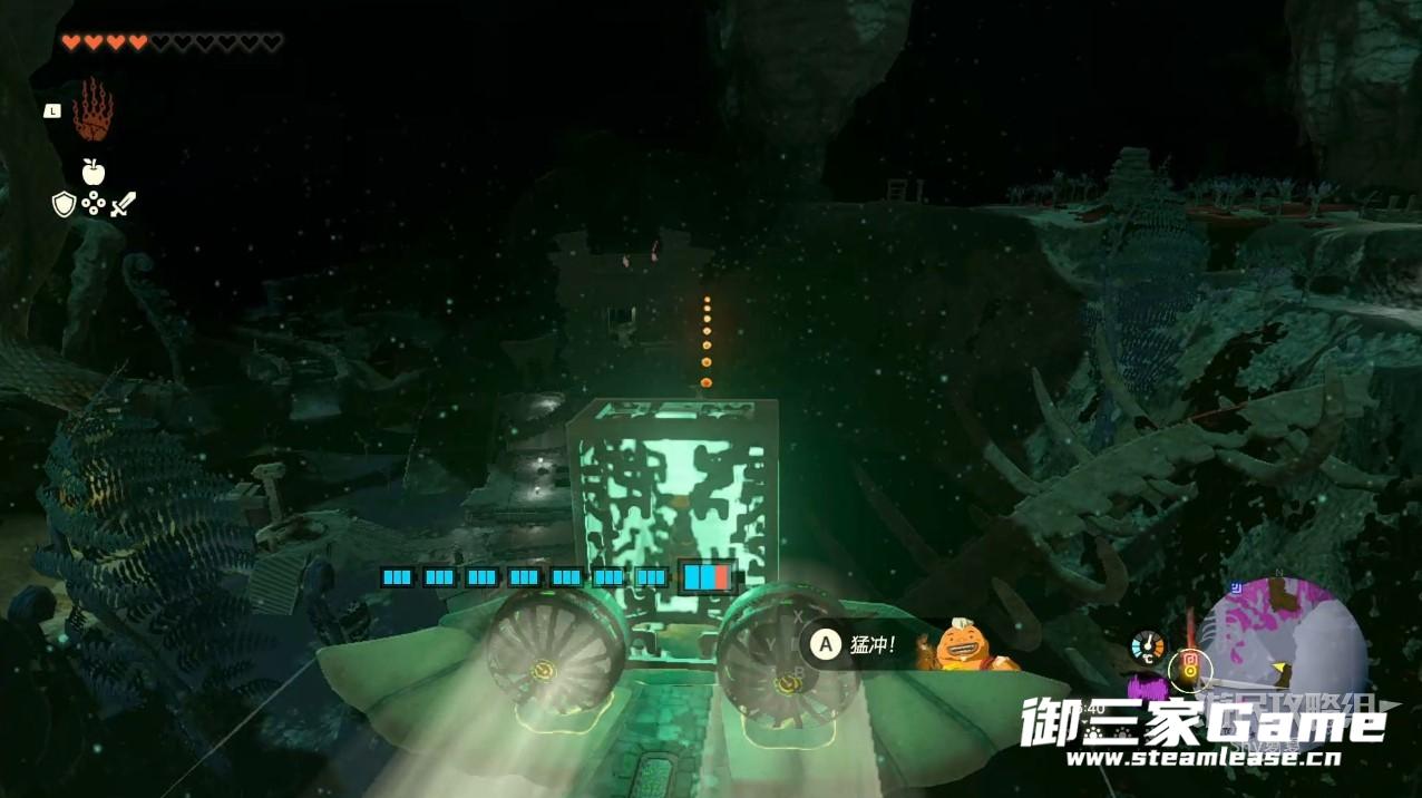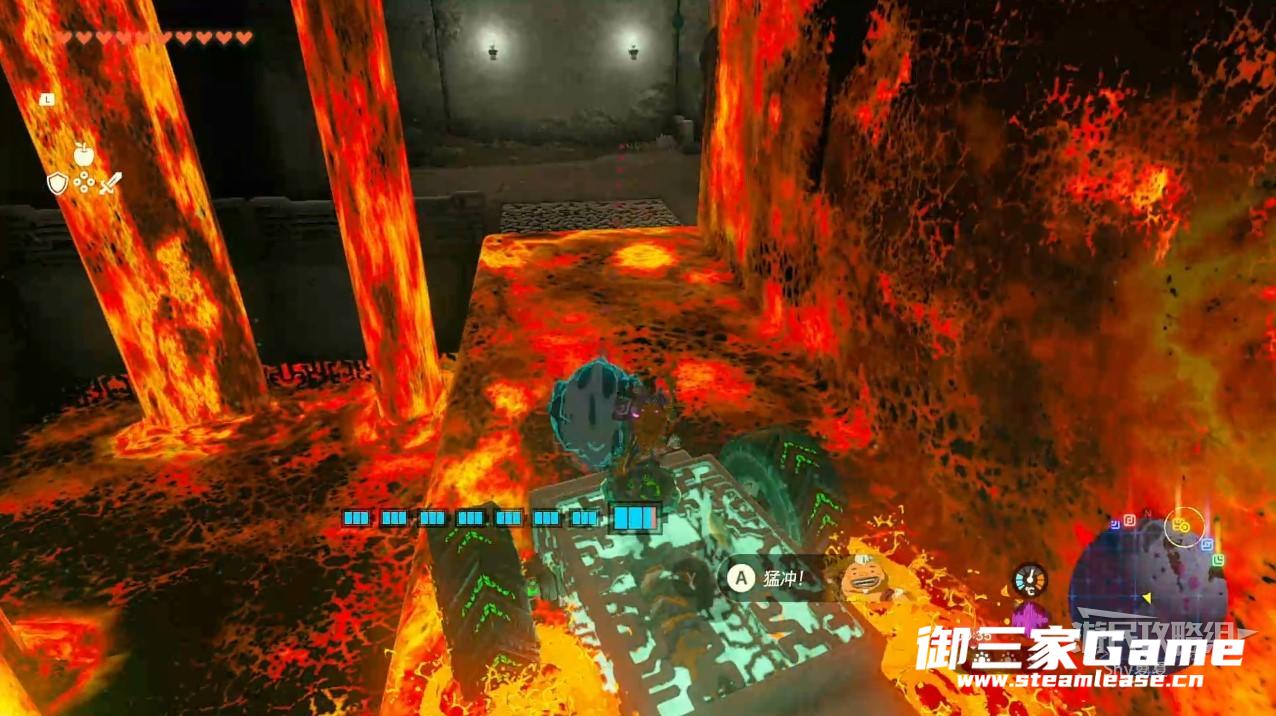 通过之后,装上两个轮子和操纵杆,通过岩浆开到对面。