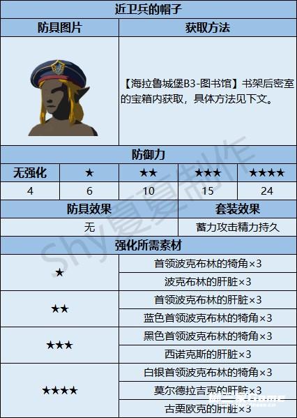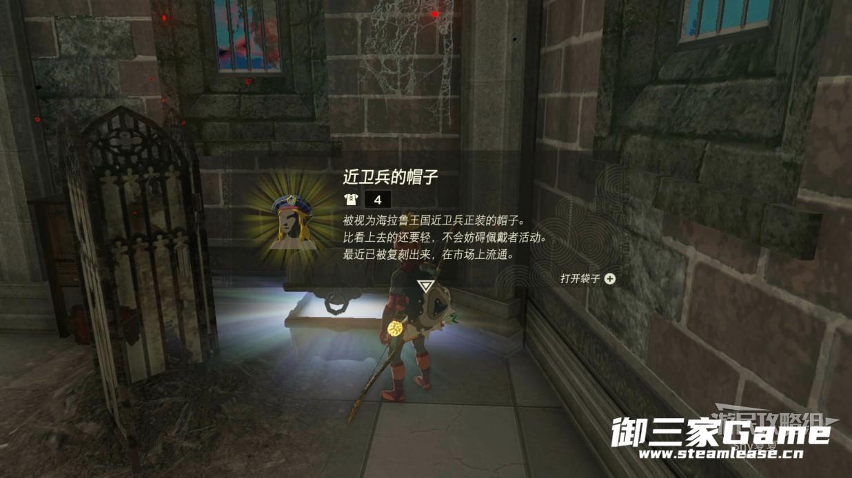 主线剧情必定会到达,在【塞尔达的房间】见过塞尔达之后,在旁边的屏风后面有一个宝箱,打开获得【近卫兵的帽子】。