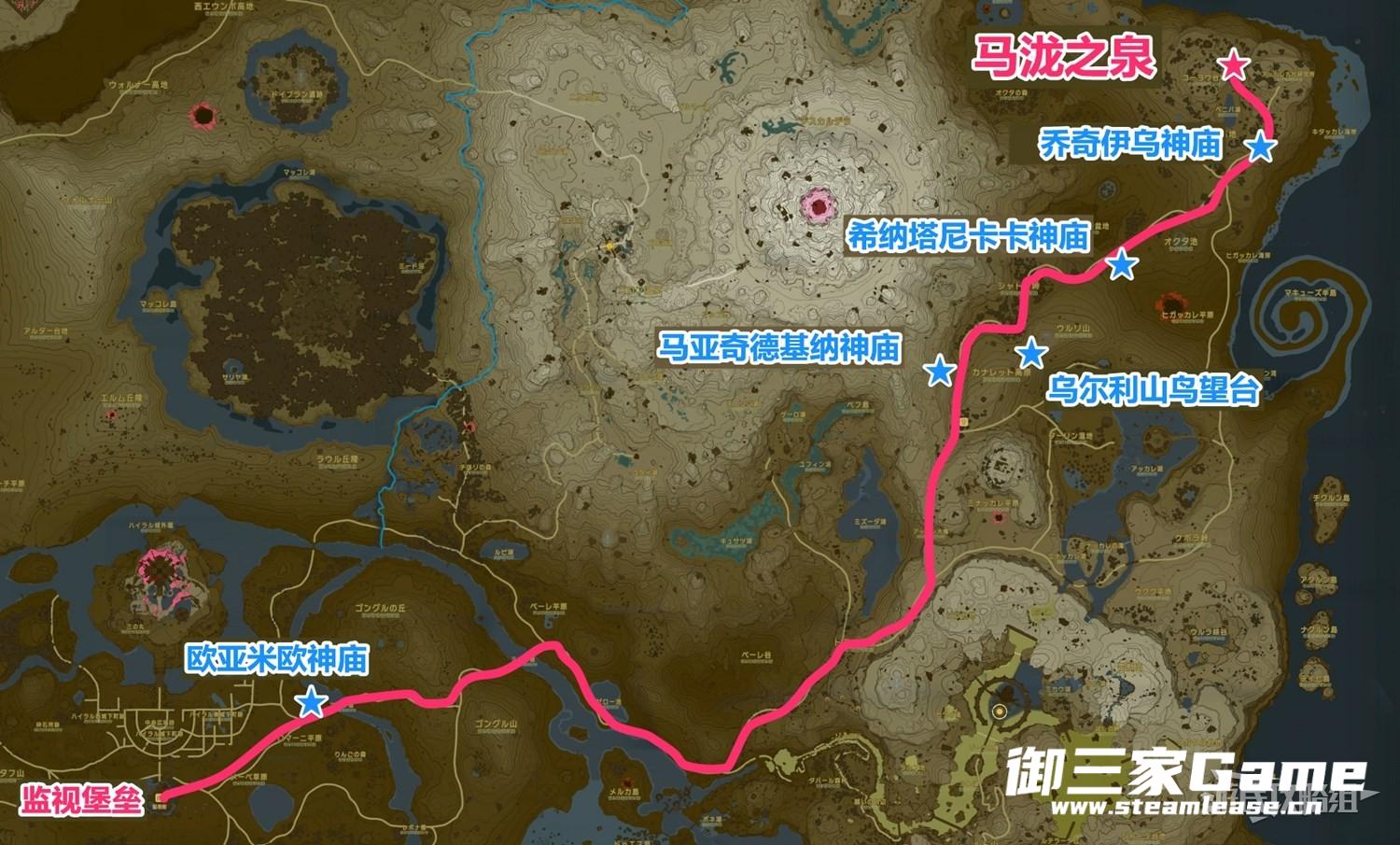 马泷之泉位于地图东北角,从监视堡垒沿着小路走,没有很难过的位置,总之整体路线非常长,沿途解锁鸟望台和神庙的话,也有助于开图。位置的线索可以通过在驿站马泷的床上睡觉时倾听神谕获得(神谕提示在海拉鲁的东北边)。