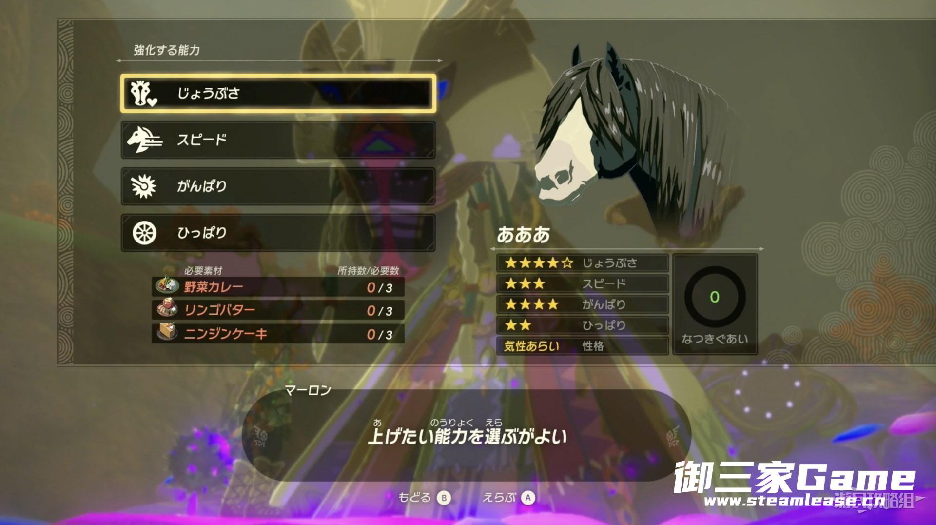 马泷可以用来强化马匹的能力值,强化需要特定的料理,所以需要额外收集材料再来制作。最高可以将马培养到★5。