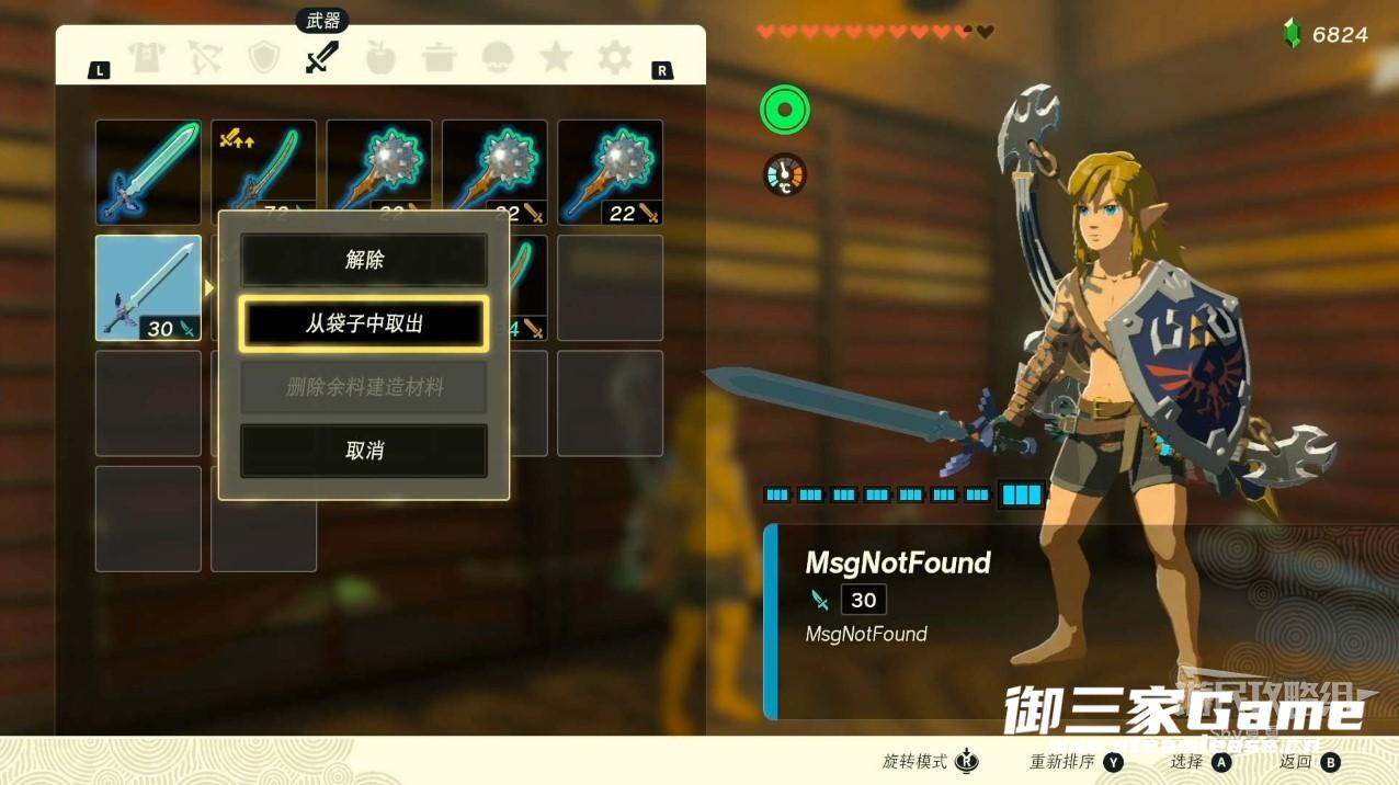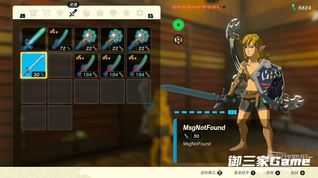拾取后,打开物品栏就会看到大师剑的图标变小了,装备其他武器,再装备大师之剑,就可以完成强化了。至此我们获得一把刀刀暴击,耐久为1,永不磨损的大师剑了,这把武器足够你畅游海拉鲁大陆了。