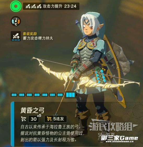 五连黄昏弓继承方法:靠墙,转身,盾反3次,打开菜单装备五连兽神弓,切换到近战武器界面,丢掉两把相同的单手剑,切换回弓箭界面,丢掉装备着的兽神弓,装备黄昏弓,快速点击两次+键,丢掉黄昏弓,关闭菜单,如果黄昏弓没丢出来卡在物品栏就成功了,捡起地上兽神弓即可。