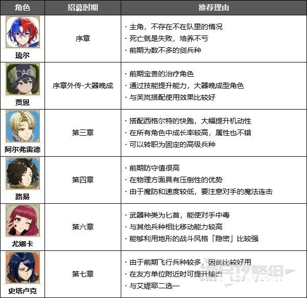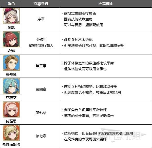 本文的角色以普通难度为标准进行推荐。火纹系列作品基本都是根据难易度不同所推荐使用的角色也会有所变化,因此请大家根据自身情况来参考。