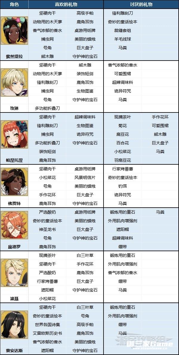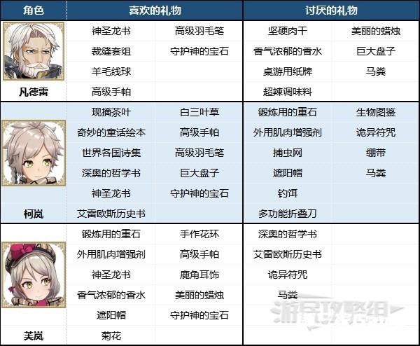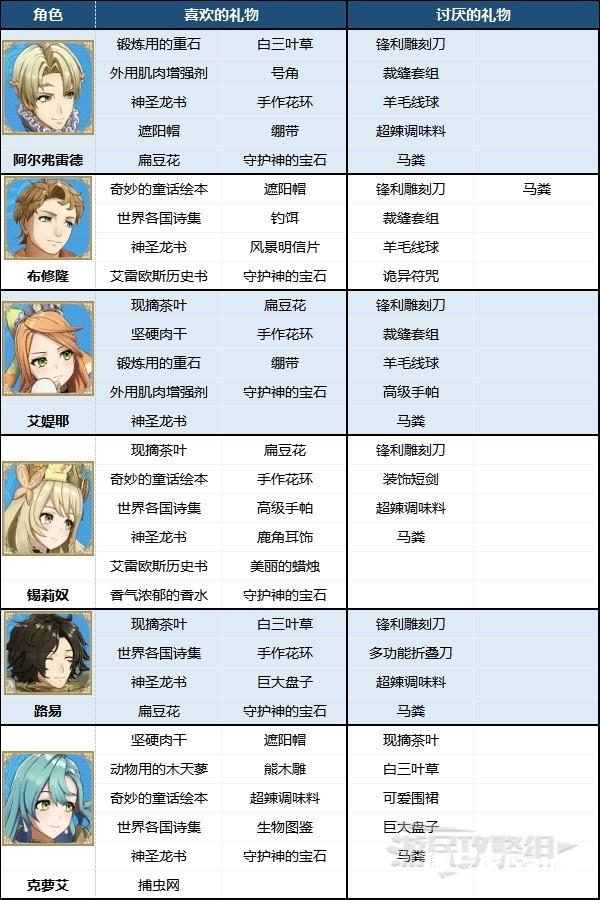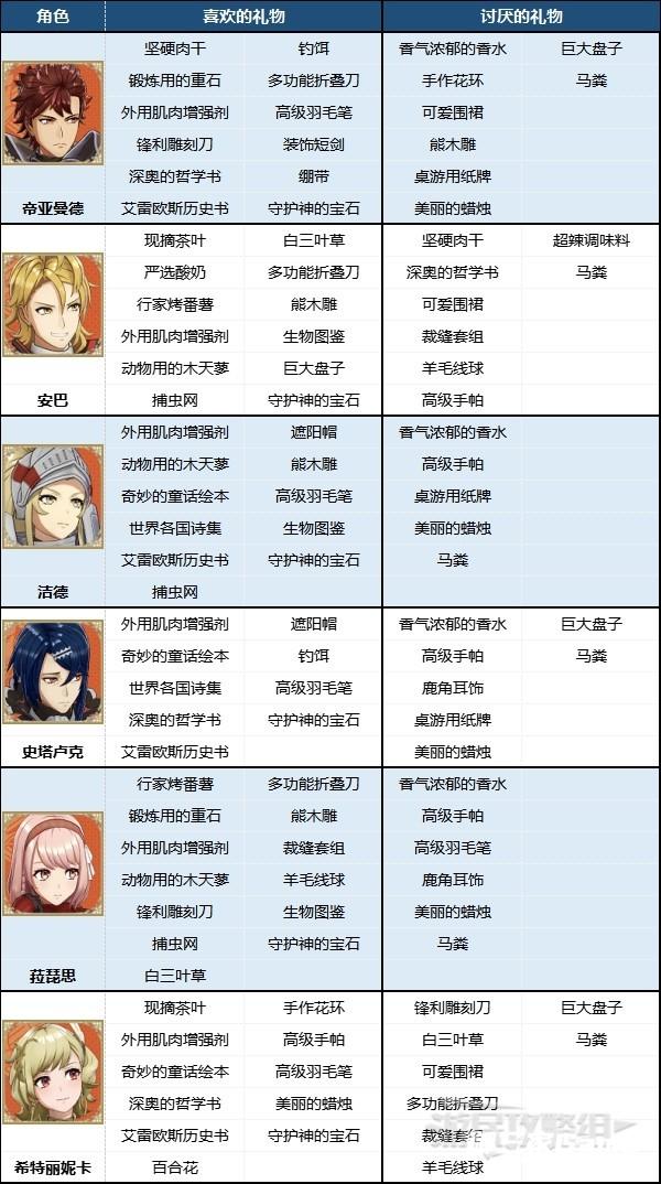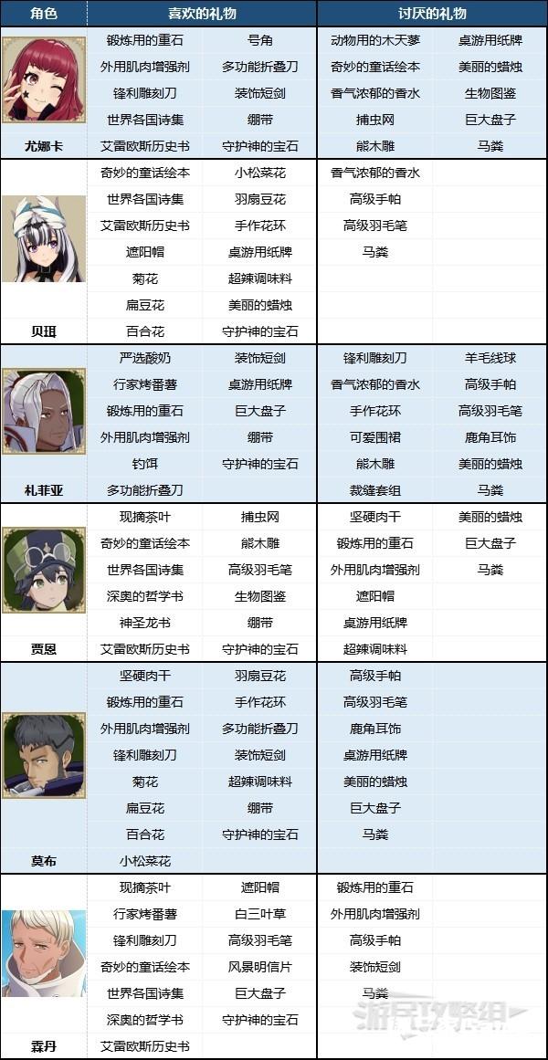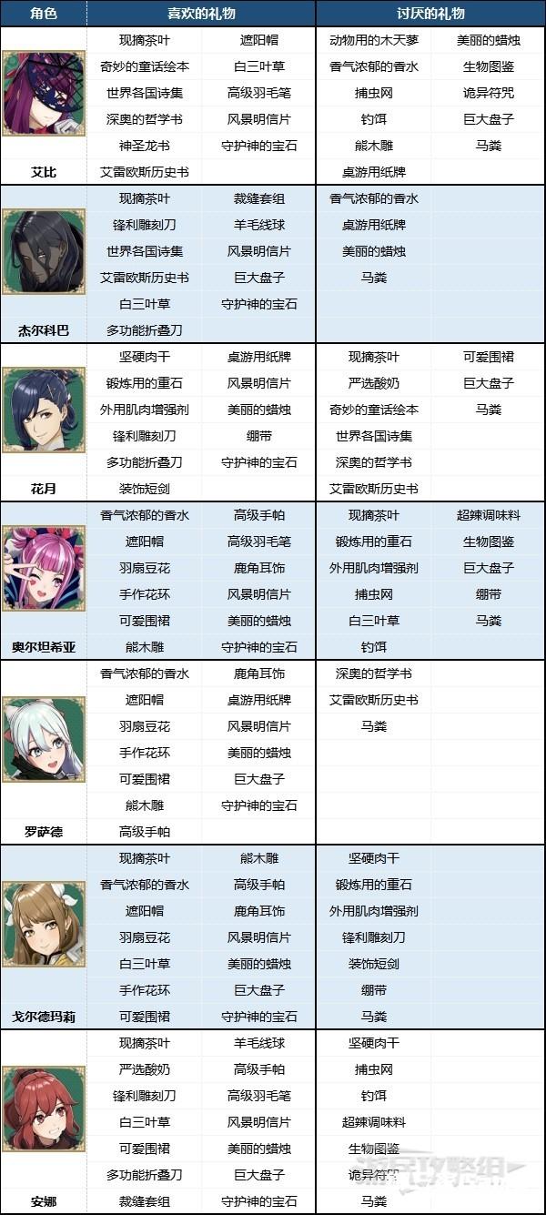 ※根据角色所属势力寻找对应表格即可快速查找角色喜欢/不喜欢的礼物