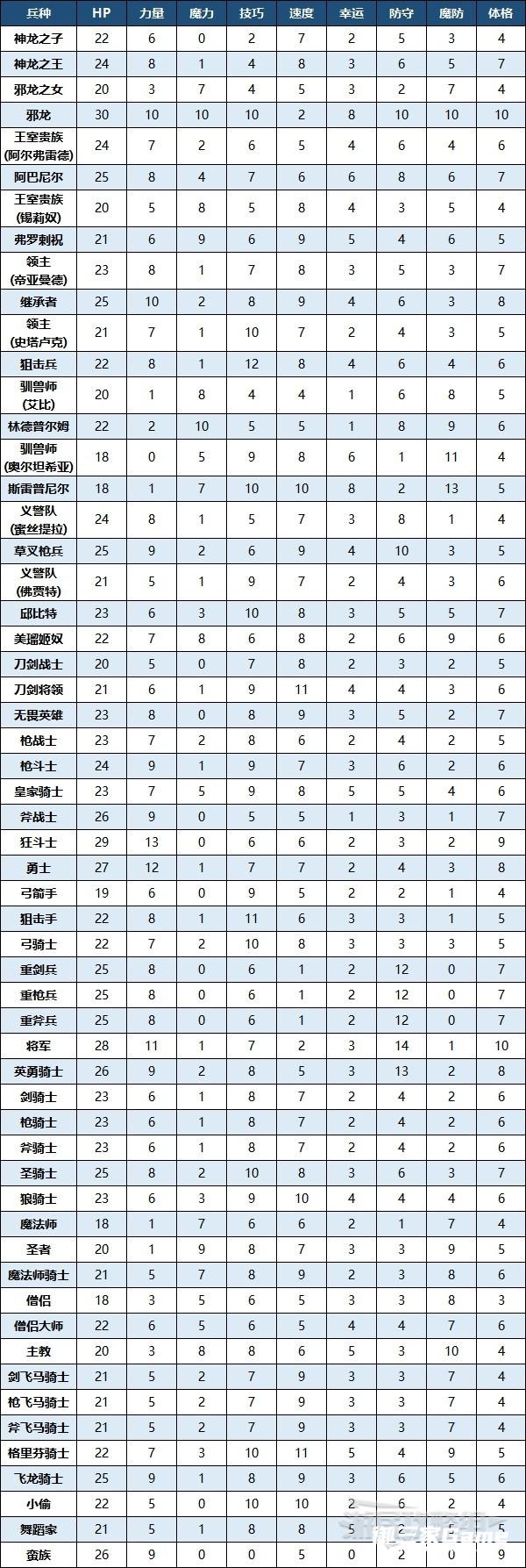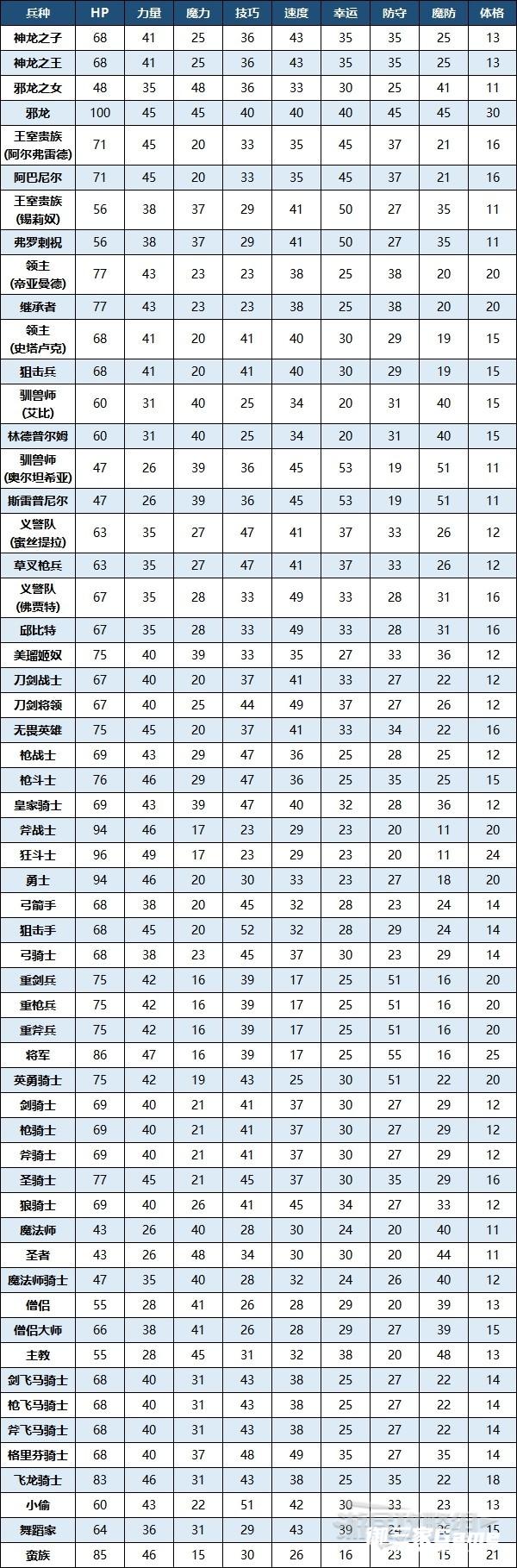 《火焰纹章结合(engage)》中的每个兵种都有不同的能力值,下面就为大家带来《火焰纹章结合(engage)》全兵种基础及上限能力值汇总,希望对大家有所帮助。