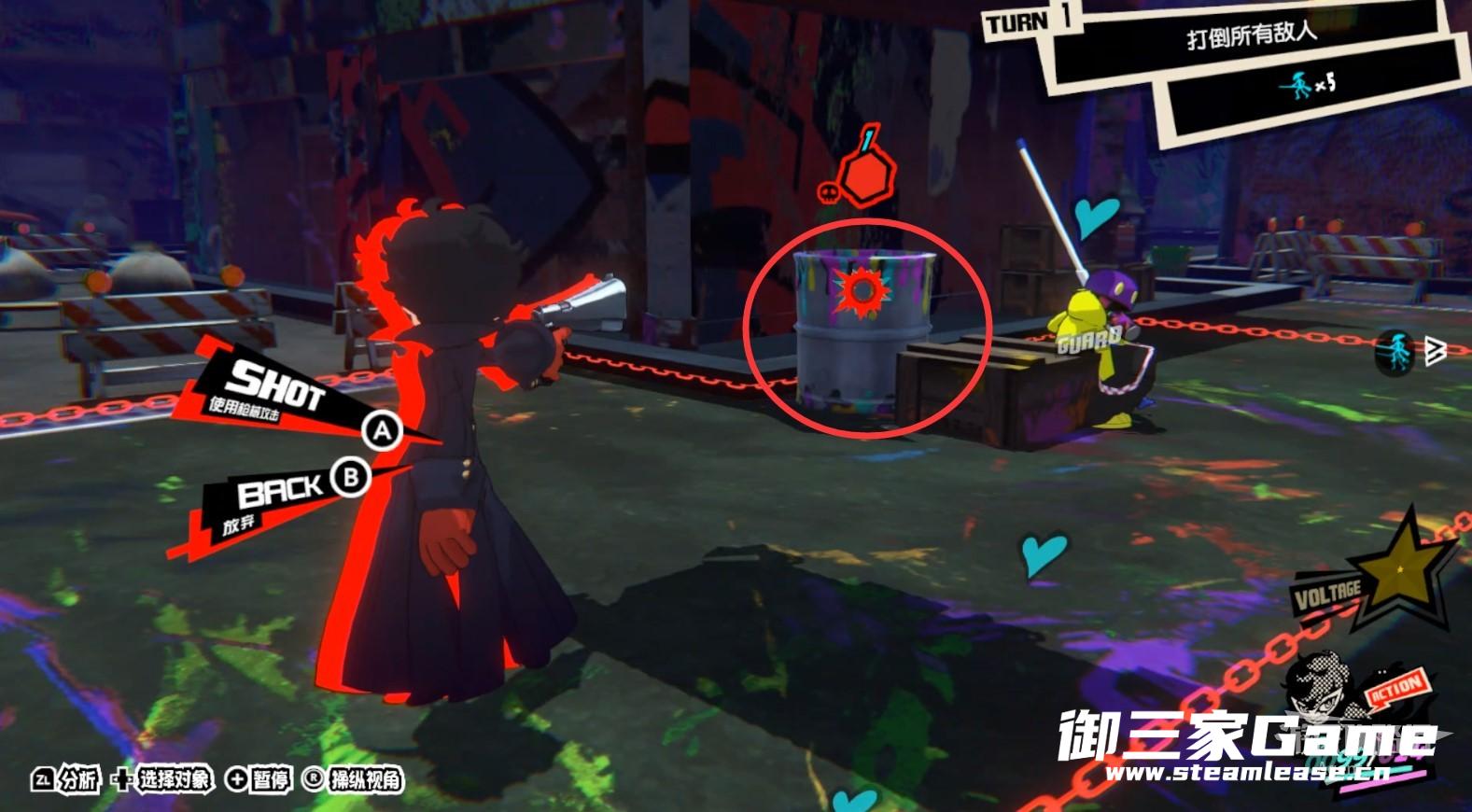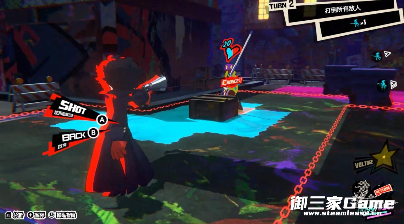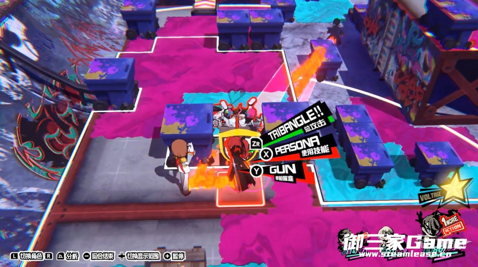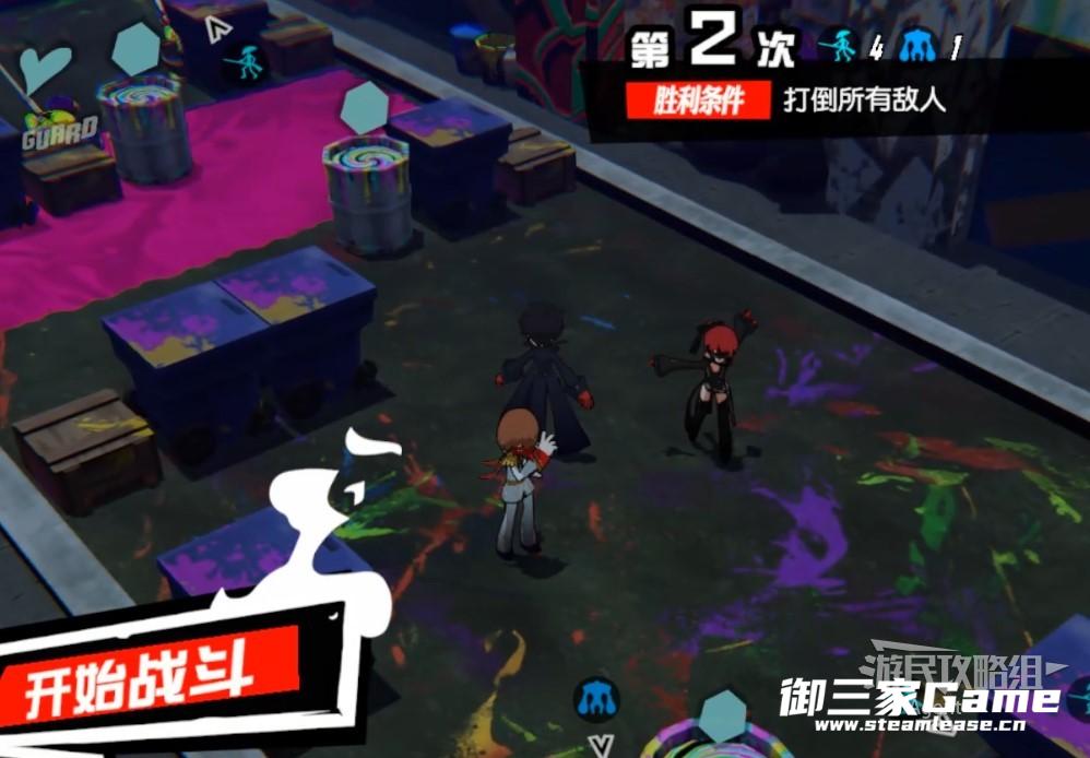 消灭关卡1的敌人后,芳泽霞、明智吾郎加入队伍。一起利用喷涂染色打倒所有敌人吧。