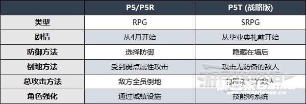 P5T是一款与P5原版和P5R玩法完全不同的游戏,在游玩期间可能需要更多地考虑策略。原版推荐给喜欢《勇者斗恶龙》系列和《世界树迷宫》系列的玩家,而P5T则推荐给喜欢《最终幻想:战略版》和《火焰纹章》系列的玩家。