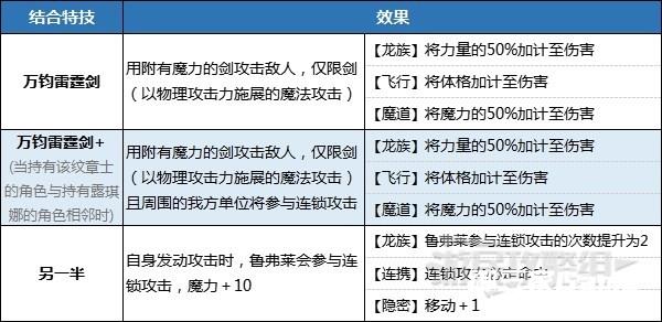 武器是射程1-2依靠魔力的「雷电剑」,特技「七色呐喊」可以使周围两格内队友的基础能力值+3,特技「偷袭」可以使角色于回避地形发动攻击时不会遭到反击。