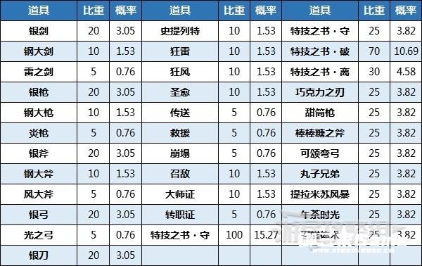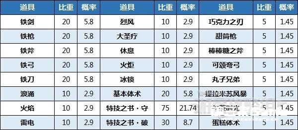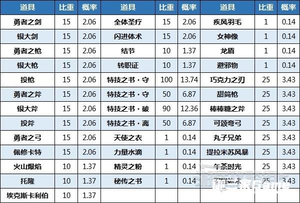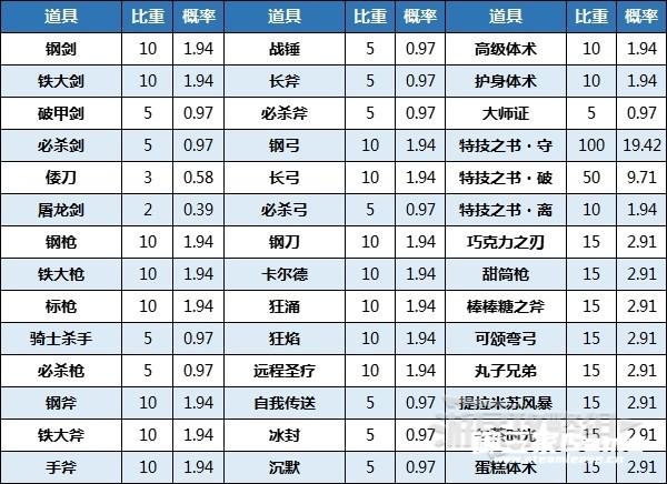 下方表格中的概率是比重相加后得到的数值,考虑到性价比每次使用水井时建议期待值达到★2,除此之外想要获得限定武器或技能书的话建议期待值达到★3。