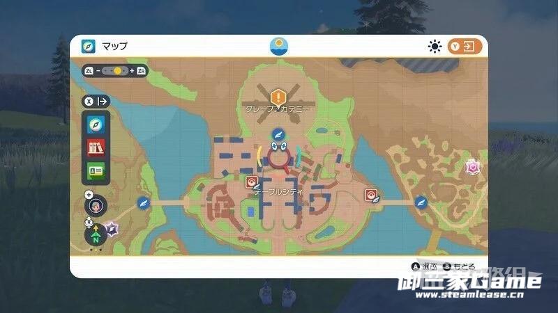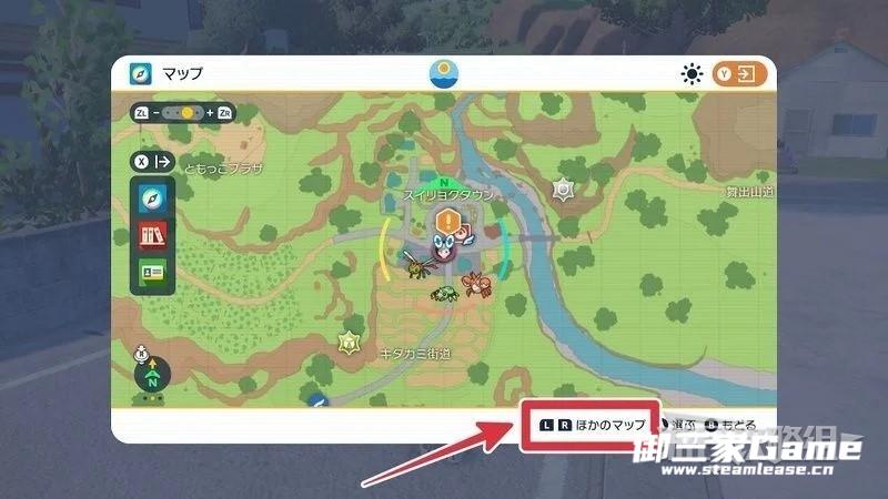 按Y打开地图,然后按L/R即可返回帕底亚地区。初次前往北上乡或蓝莓学园后,即可随时从地图上切换帕底亚地区、北上乡和蓝莓学园。