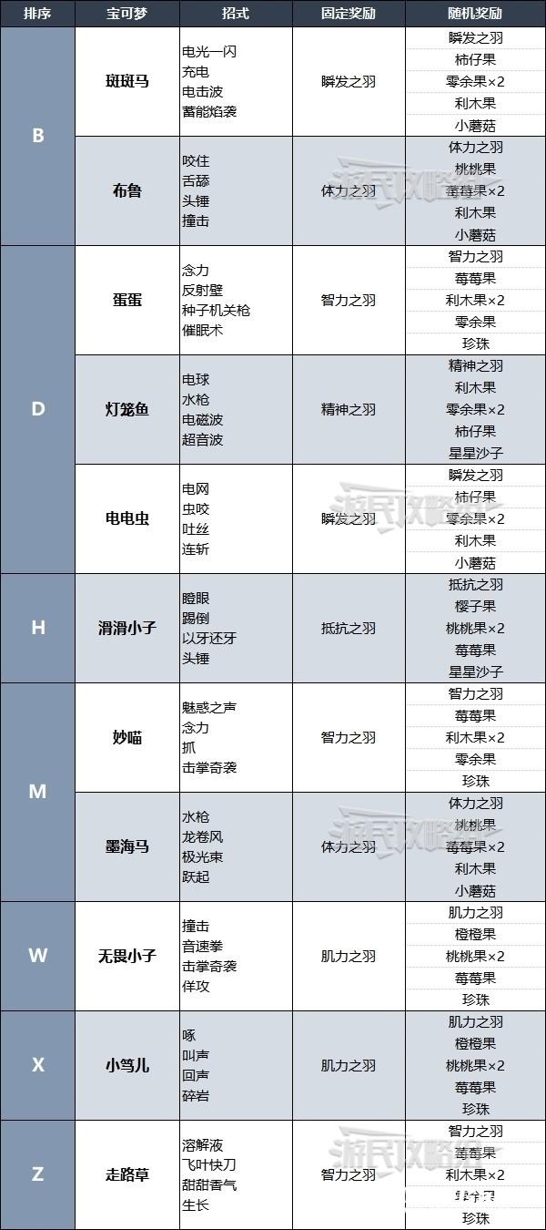 下方表格内的奖励省略了通用奖励「经验糖果」、「掉落物」和「太晶碎块」,所有的太晶碎块会按照团体战中的宝可梦属性掉落。宝可梦招式是在捕捉时决定的,在难度较高的团体战中,宝可梦可能会使用超过5个招式。
