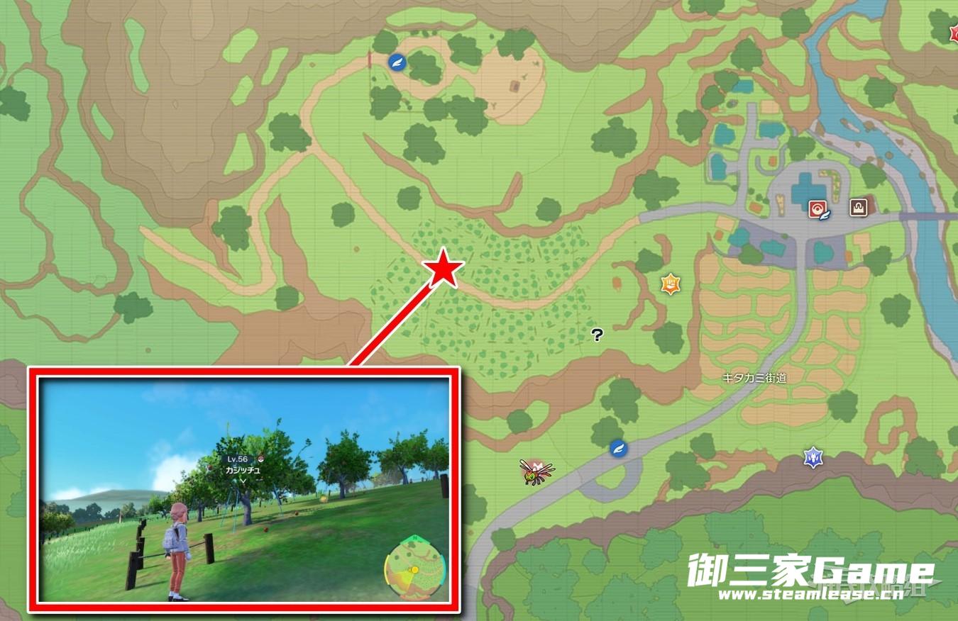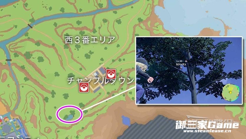 位于宝伴广场南边的苹果之丘。啃果虫通常会出现在树上,按ZL键对准树顶和树枝附近方便寻找。啃果虫出现后会看到一个标记,撞树使其掉下来触发战斗。