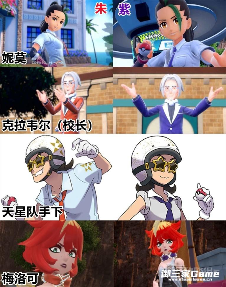 在《宝可梦:朱》中登场的宝可梦博士为奥琳(下图左);在《宝可梦:紫》中登场的宝可梦博士为弗图(下图右)。