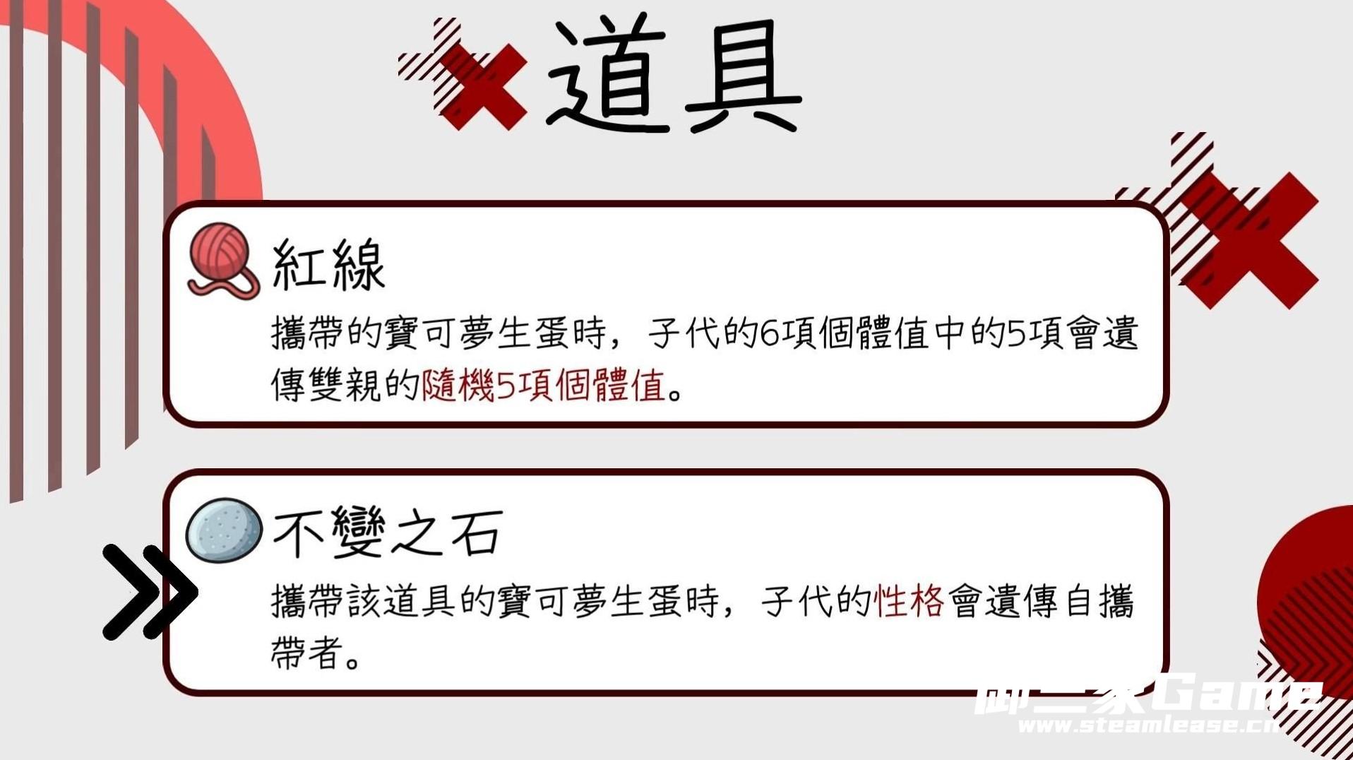 个体值和性格的机制和前作相似,要生出拥有优秀个体值的宝可梦,便需要红线和不变之石这两个道具。红线可以绑定其中父母的五项个体值,不变之石可以绑定性格,各位可以参照前作的生蛋方式。