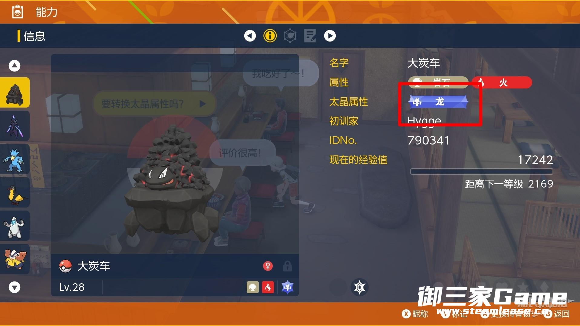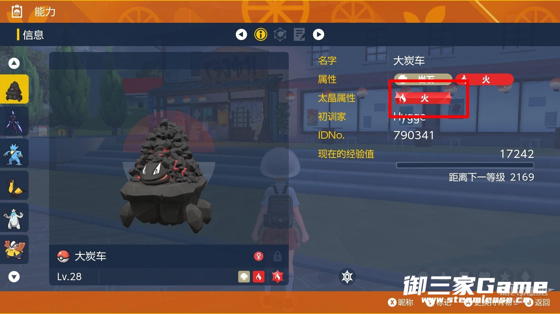 以下图所示大炭车为例,该宝可梦的太晶属性为【火】。