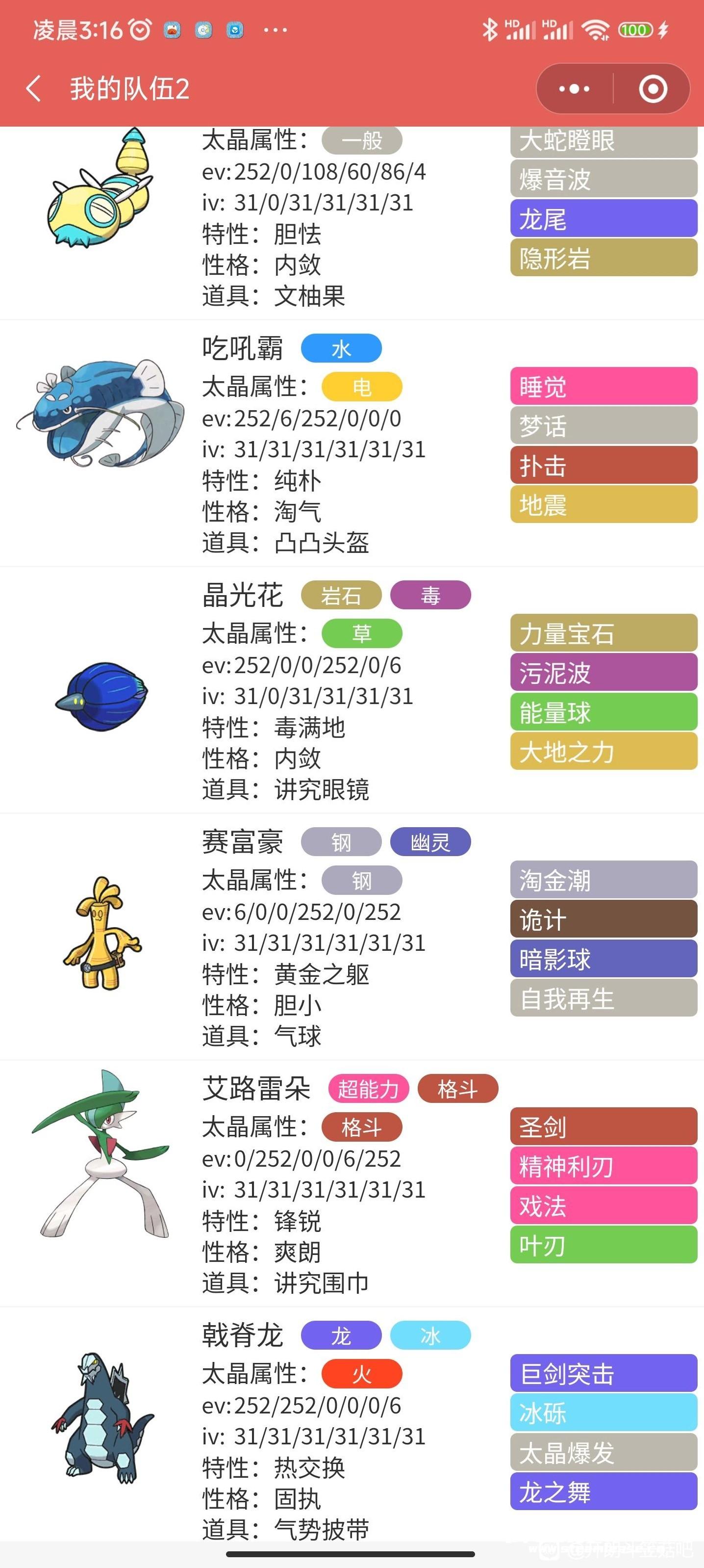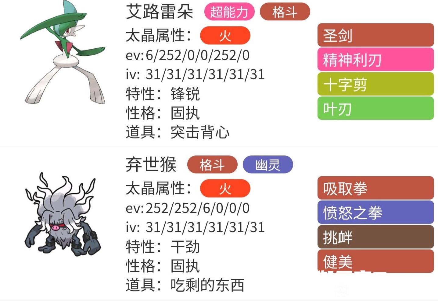 艾路雷朵,艾路雷朵一直是我非常喜欢的一只pm,g9有了锋锐之后终于能用了,围巾戏法三攻配招,能解决很多盾牌,而且输出力度也很足,钛晶斗本系一发圣剑下去,帝牙卢卡都要发抖。