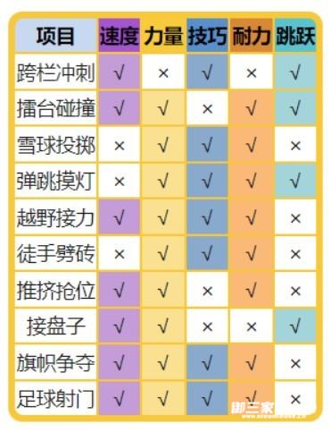 一共有五种体能,每项全能竞技赛项目至少要用到三种。