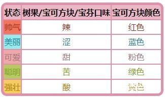 宝可方块和宝芬均由树果来制作,树果的口味会影响制作出宝可方块或宝芬的口味和颜色。不同口味的宝可方块或宝芬会影响对应的状态。对应列表如下: