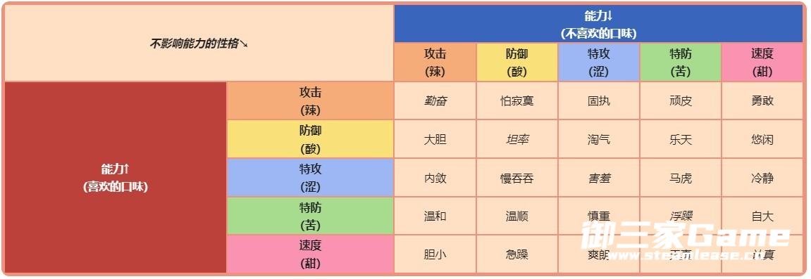 性格:宝可梦的性格会增强它的一项能力,同时减弱一项能力,幅度为±10%。当增强与减弱的能力相同时,能力没有任何变化。第八世代起,可以通过薄荷来改变增强和减弱的能力(但并不改变宝可梦的性格)。以下是未使用道具前性格对宝可梦能力和喜欢口味的影响: