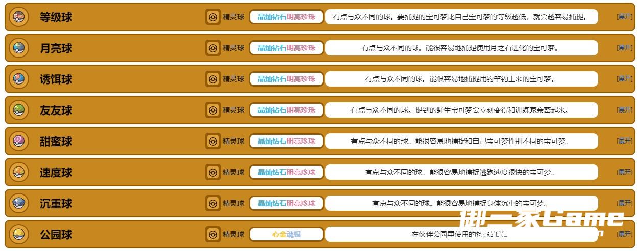 这些精灵球在《金/银》中初次登场,但在之后的第三世代游戏和《钻石/珍珠/白金》中它们却完全失去了踪影,直到《心金/魂银》中才回归。它们大部分是由钢铁利用球果制作的,而公园球原是捕虫大赛中使用的特殊的球,在回归后变成了朋友公园专用的球。这些球的动画效果起初与普通的精灵球相同,直到《X/Y》的1.2版本它们才分别拥有了新的动画效果。如果把用这些精灵球捕捉的宝可梦传送到不存在它们数据的《钻石/珍珠/白金》中,这些精灵球就会变成普通精灵球的模样。在第五世代到第七世代,虽然数据中存在这些精灵球,但它们并非是属于精灵球道具而是属于可交换道具所以无法使用,从第八世代起,这些精灵球恢复精灵球道具类型,可在战斗中使用。