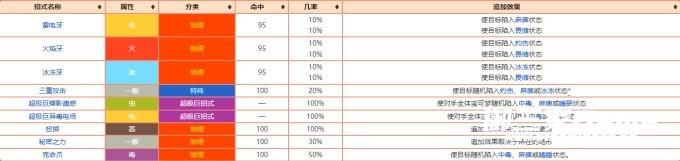 下列招式中,雷电牙、火焰牙、冰冻牙的追加效果都是独立计算的,有可能两种效果同时发生。