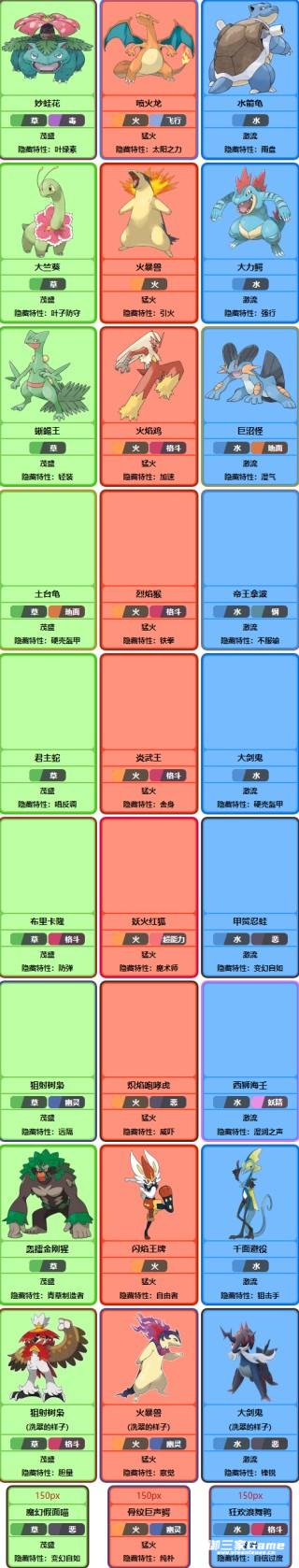 除《皮卡丘》和《Let's Go! 皮卡丘/Let's Go! 伊布》外,最初的伙伴都是从草属性、火属性、水属性三种特定的宝可梦中选择一只。第三世代引入了疯狂植物、爆炸烈焰、加农水炮这三个招式,只有对应属性的最初的伙伴最终进化型才能被教授。三种属性的最初的伙伴的普通特性均为茂盛、猛火或激流。第五世代引入了合体招式,在第七世代之前只有对应属性的最初的伙伴才能被教授。