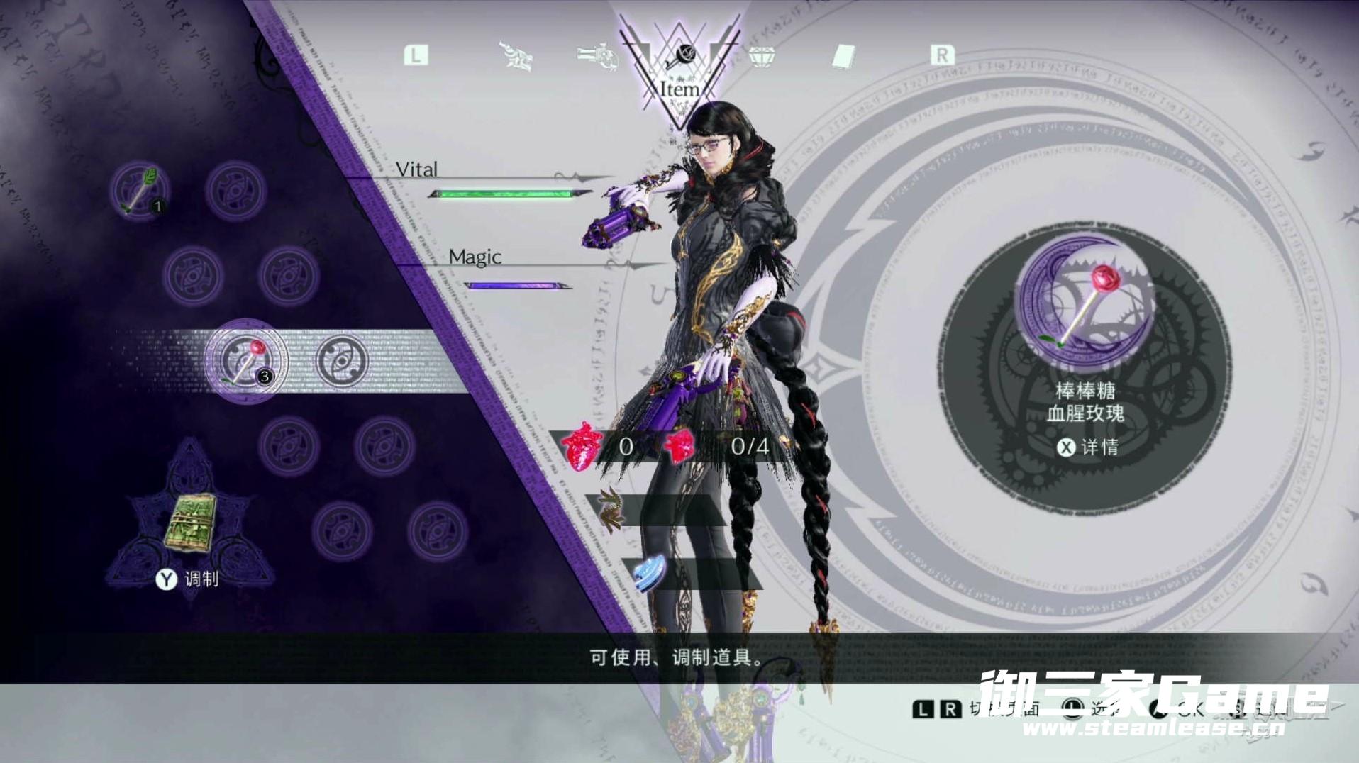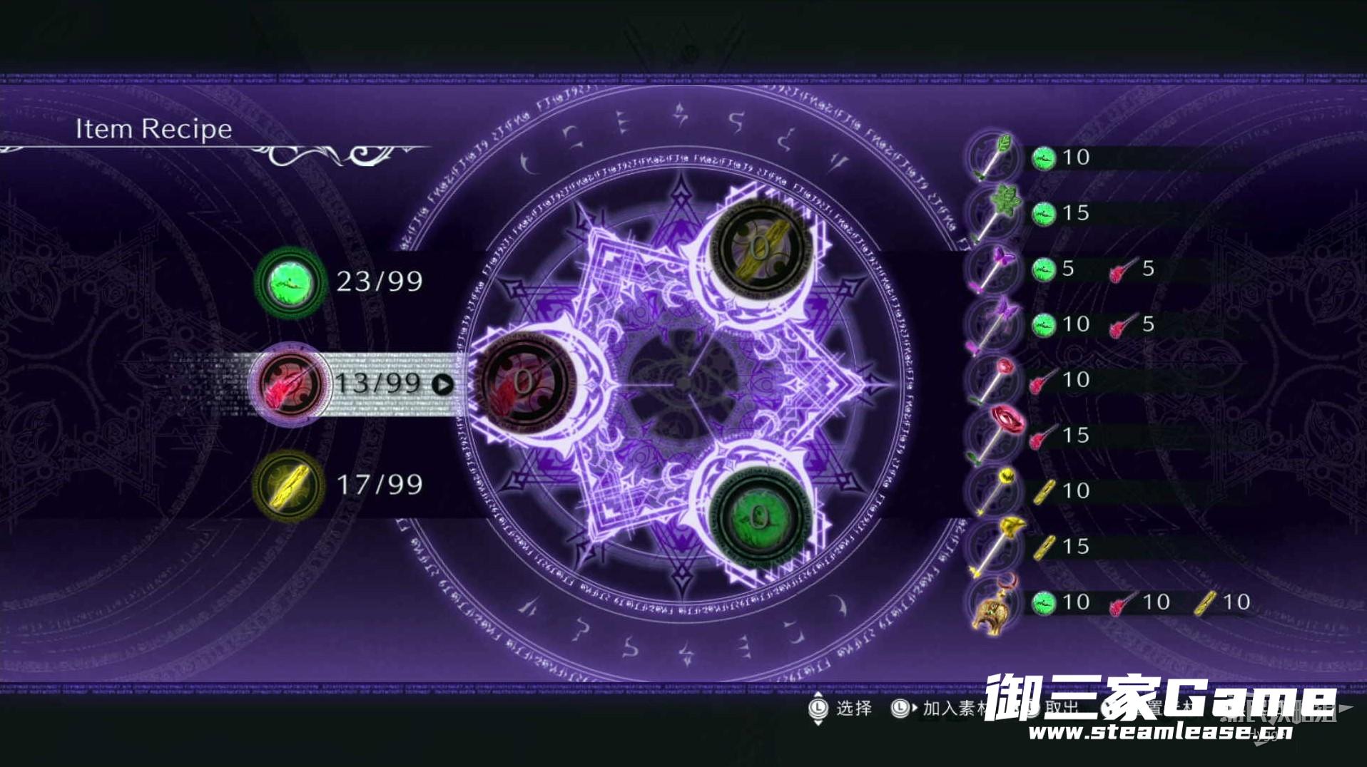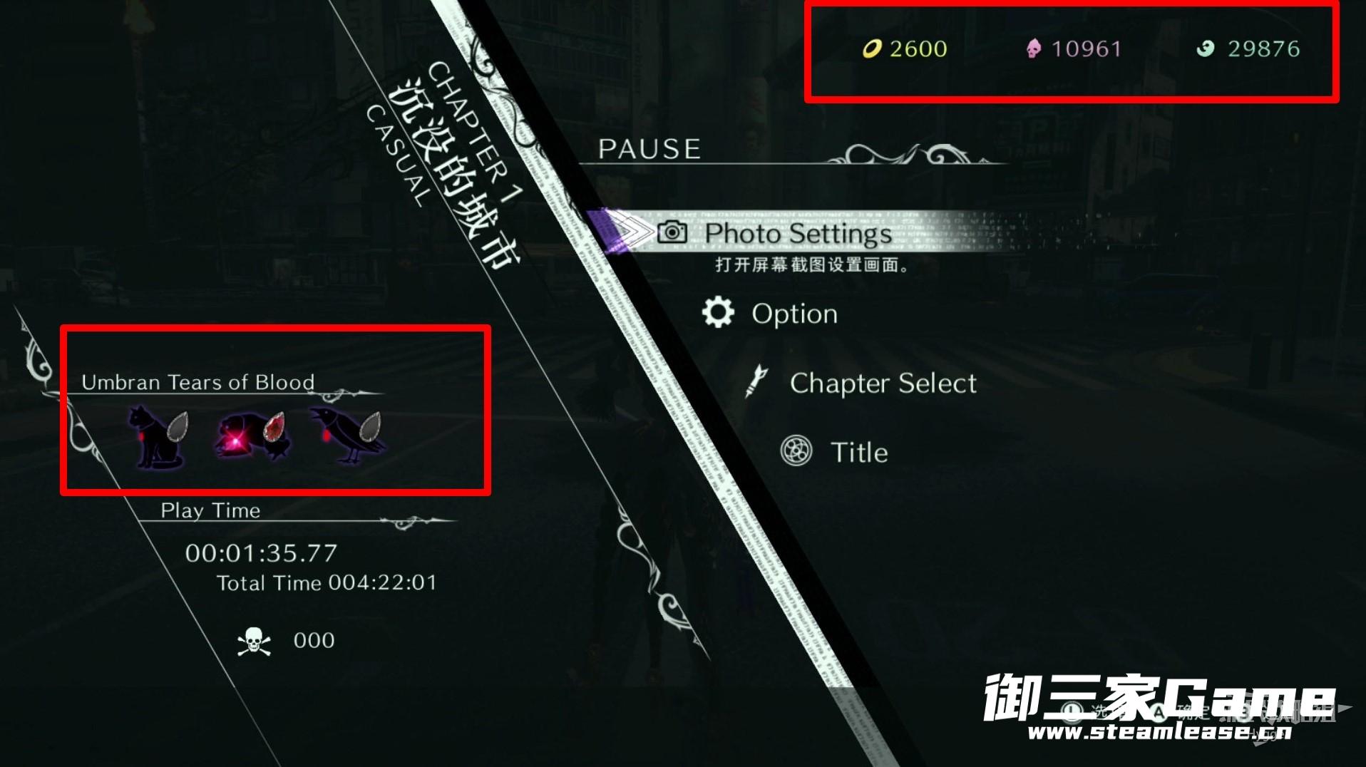 在界面左侧显示当前关卡中魔女的血泪收集情况,每个关卡中均有猫、蟾蜍和乌鸦三只动物各自携带一个,需要玩家在关卡中寻找。