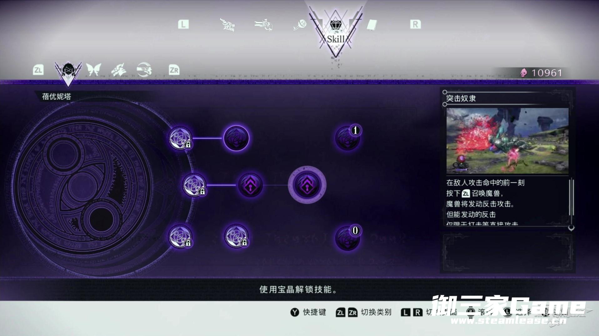 第四个页面为技能页面,花费在游戏中获得的宝晶可以解锁新的技能,贝姐本体和每种武器均有独立的技能可供学习。