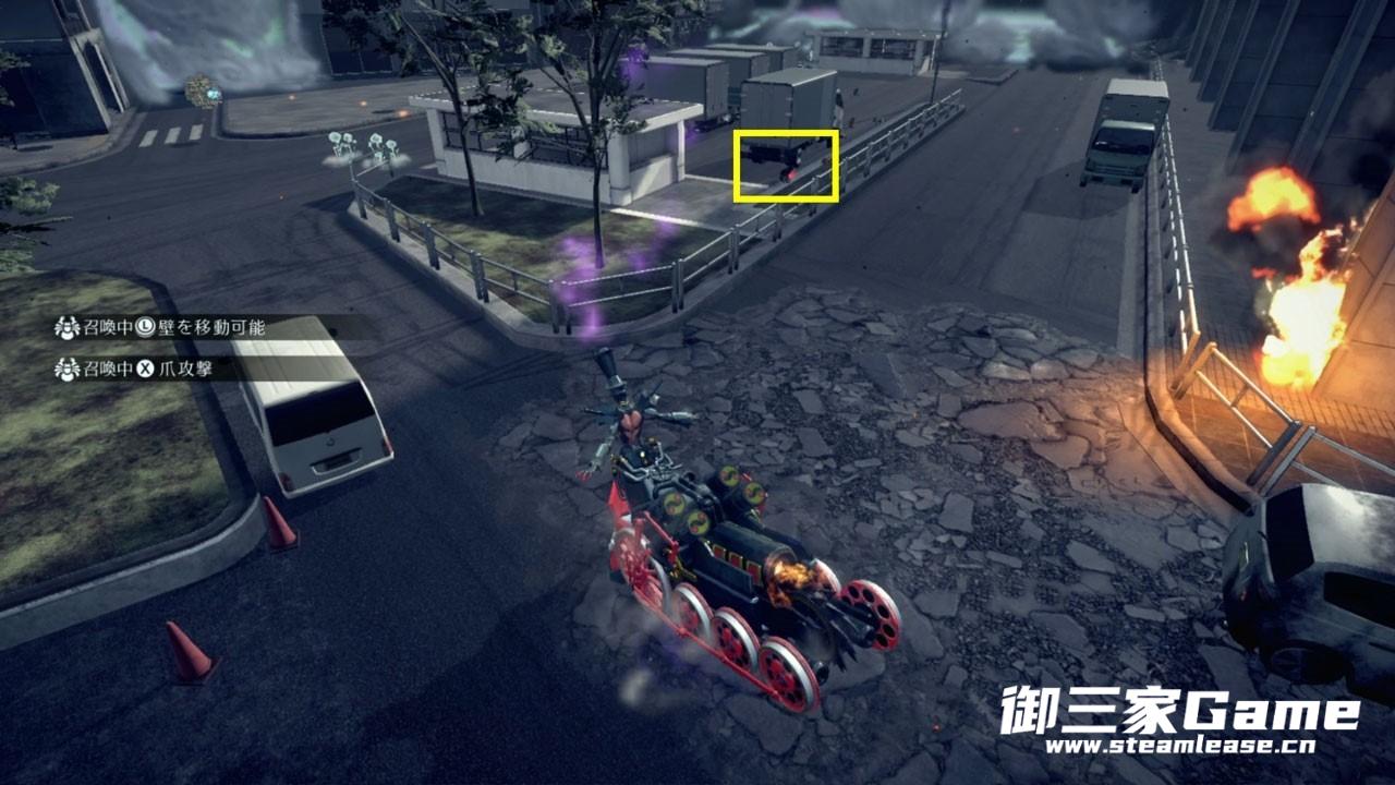 ②V4后穿过大门,右侧有一栋建筑,可以通过摧毁建筑顶上的桶放下梯子来诱导猫咪