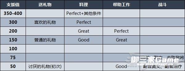 通过料理提高的支援值很多,但料理需要食材,并且可获得支援值的量计算起来也有些复杂: